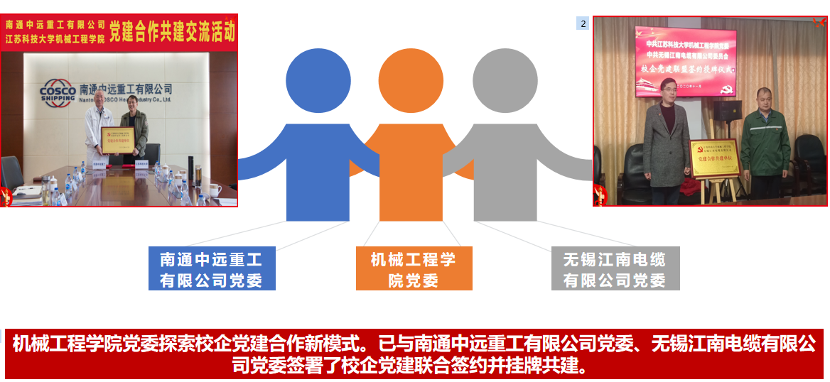 貫徹落實黨管人才的政策,圍繞人才培養,積極探索校企黨建合作新模式。已與南通中遠重工有限公司黨委,就“卓越工程師計劃”、“暑期社會實踐”、“科技競賽”、“輔導員精品項目”、“潤業計劃”、“本科生創業計劃”等幾個合作平臺進行了深度洽談和交流,達成初步共識。與無錫江南電纜有限公司和南通中遠重工有限公司進行了校企黨建聯盟簽約并掛牌共建。