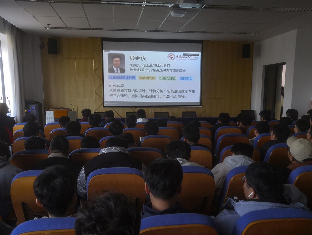 顧繼俊副教授首先介紹了海洋石油開發(fā)當(dāng)中用到的一些裝備及平臺形式,并針對適合于深水的平臺與立管系統(tǒng)進(jìn)行了詳細(xì)背景介紹。接著,顧繼俊副教授對深水立管系統(tǒng)受到的復(fù)雜載荷進(jìn)行了分析,讓師生們深入了解到深水立管系統(tǒng)所處的海洋工況及面臨的難題。然后,顧繼俊副教授結(jié)合團(tuán)隊近幾年的研究成果,深入介紹了基于最小勢能原理的多種構(gòu)型深水立管(SCR、緩波形、陡波形及自由站立式等)的整體控制數(shù)值模型分析方法,以及基于共旋坐標(biāo)法的深水立管有限元模型分析方法,以此解決大長細(xì)比立管在復(fù)雜載荷耦合作用下的大位移小應(yīng)變問題,闡明觸地段與非線性海床的相互作用機(jī)理以及扭轉(zhuǎn)失穩(wěn)機(jī)理。最后,顧繼俊副教授對未來工作進(jìn)行了展望,認(rèn)為相應(yīng)數(shù)值模型的成功應(yīng)用可加速具有自主產(chǎn)權(quán)的國產(chǎn)化軟件開發(fā),從而保障我國海洋油氣開發(fā)中的管線安全運行,具有重要的工程和戰(zhàn)略意義。會上,顧繼俊副教授生動而精彩的講課,獲得了師生們的陣陣掌聲。