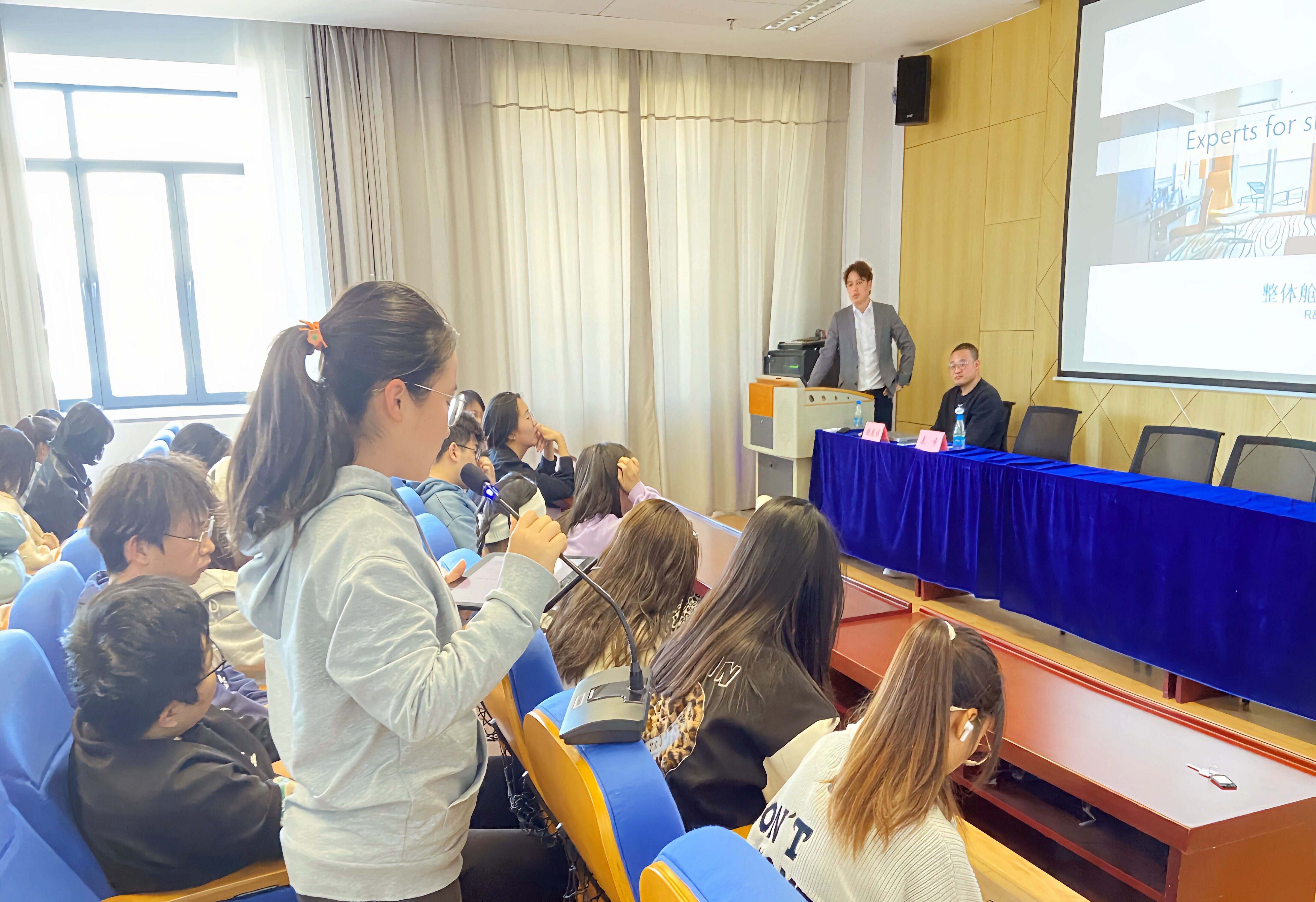 首先魏居祥以R&M公司的歷史及發展現狀為引,從國內郵輪內裝產業發展現狀和國內與國外郵輪內裝產業發展現狀的比較兩個角度介紹了我國豪華郵輪產業的發展情況。接下來,魏居祥以兩個實際落地項目為案例,為師生系統地講解了郵輪內部裝飾的設計原則,設計方法和注意點,特別強調了船上人機尺度與陸地建筑的異同點。第一個案例是傳統郵輪的模塊化內裝單元,他向同學們說明了現代西方內飾建造的最新理念:預制整體艙室的概念和意義;第二個案例是“Smart Cabin”智能艙室前沿智能化設計理念的原型,強調智能不僅僅是智能終端,智能產品等單一的智能化,而是全艙室的、整船的、系統的智能化。最后的交流環節中,學生們踴躍提問,正在進行畢業設計的19級學生提出現有郵輪內裝是否考慮到適老化的設計,如何將中式風格更好的融入設計中進而更易被用戶接受等問題。魏居祥和袁峰從設計思路,設計方法,國際法規和標準等方面細致耐心地回答了同學們的提問。
