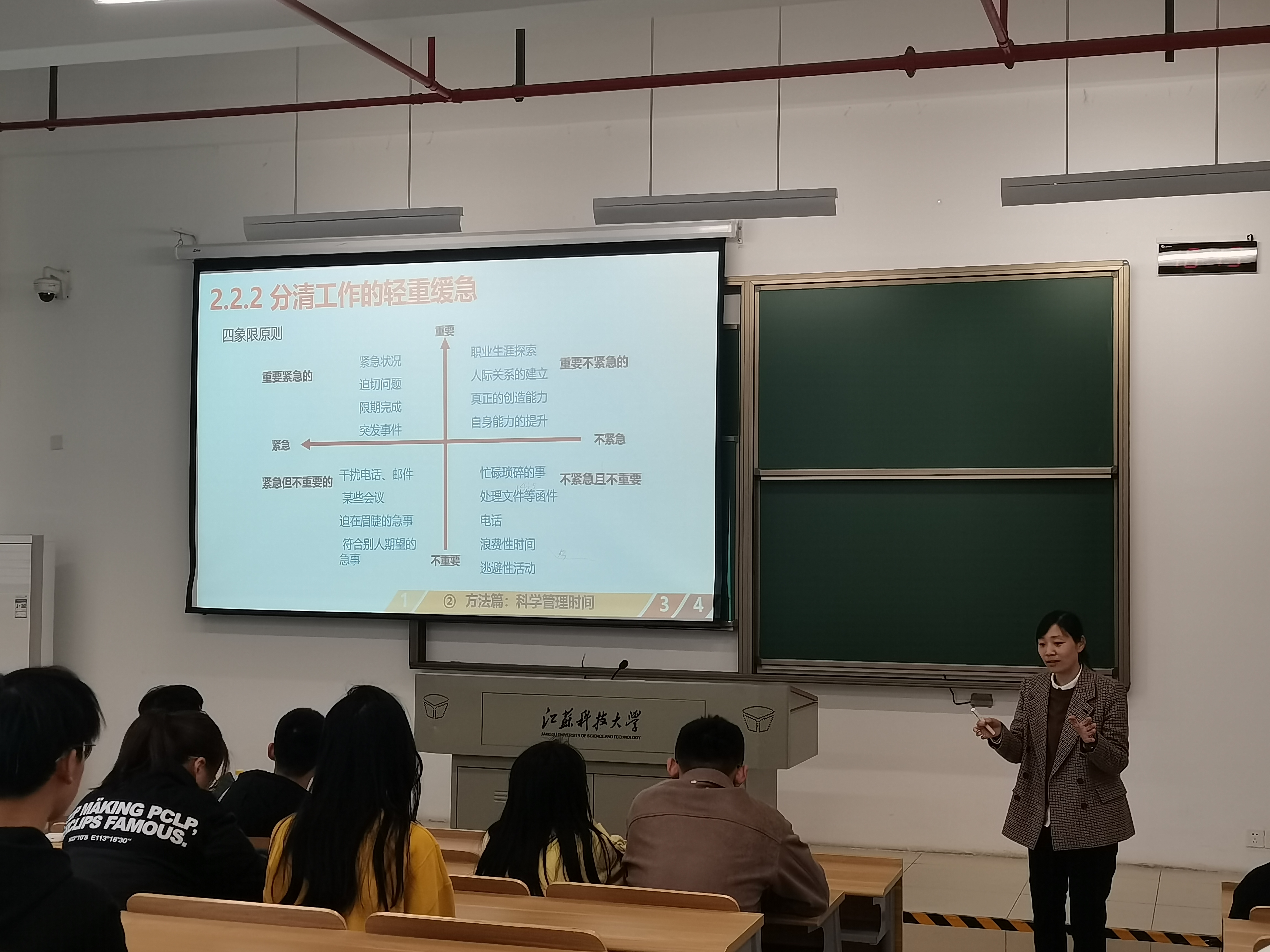 3月16日上午,由江蘇科技大學機械工程學院與心理健康教育中心主辦、經濟管理學院、能源與動力學院協辦的心理健康教育系列專題講座——《壓力管理與心理健康》于篤學樓303順利開展。本次講座,特別邀請江蘇科技大學心理健康教育中心專任教師謝莉副教授主講,機械工程學院心理輔導員譚靜主持,機械工程學院、經濟管理學院及能源與動力學院的60余名研究生和本科生參加。