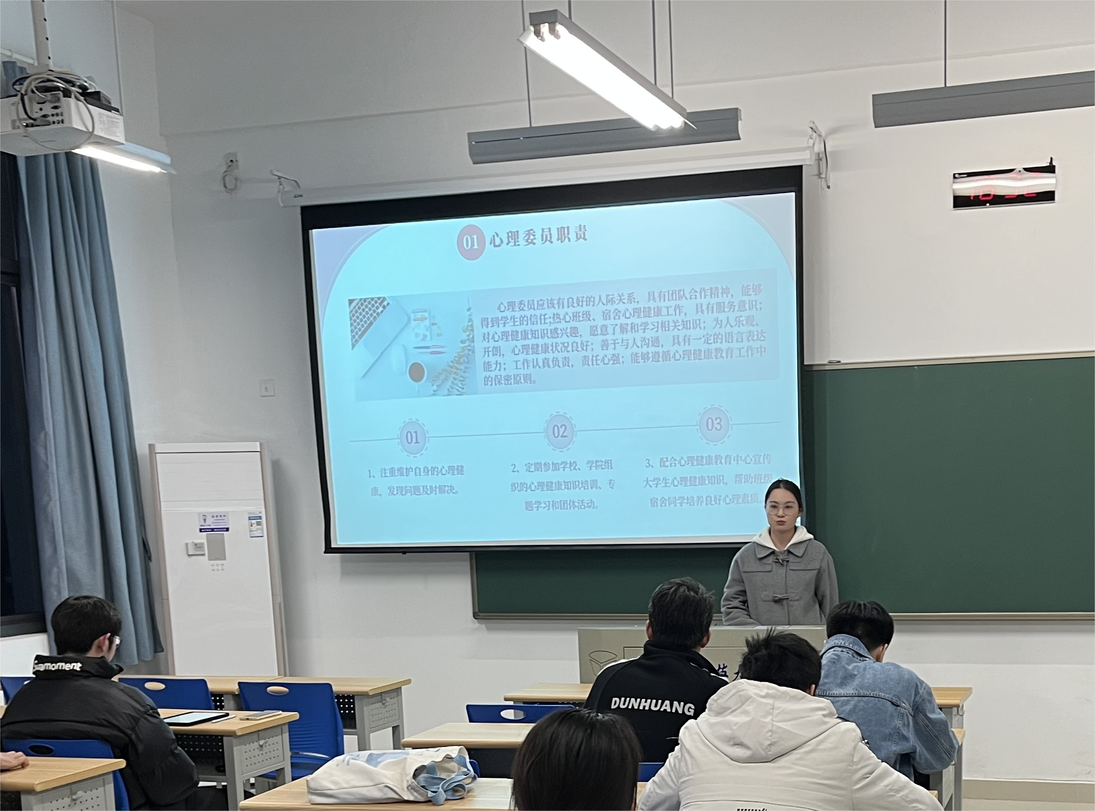 譚靜首先宣布了本學年“重塑心秩序,青春再起航”大學生心理健康教育主題,提出了相關主題的大學生心理健康教育系列校級作品征集活動、第七屆“世說新語”心理情景劇大賽院內選拔賽的要求,并給心理委員布置了任務。隨后,對心理委員提出了三點工作要求:一是要積極發揮心理委員的主觀能動性,形成主動觀察、及時反饋的良好工作交流機制;二是要加強心理健康教育工作與班集體的聯系,形成多元組織、共建共促的心理健康特色循環;三是要提升心理健康教育隊伍的專業素養,以更好地主動協同、高效配合學校和學院開展心理知識普及宣傳工作。希望各班級心理委員能夠做到時刻與同學同在,及時發現問題,解決問題,維護心理健康,共創美好大學生活。