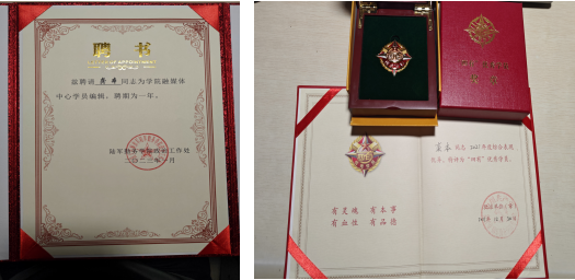 在部隊服役5年間,龔本因工作突出,共計獲得3次嘉獎,一次被評為優(yōu)秀義務(wù)兵,一次被評為“四有”優(yōu)秀學(xué)員,并于2022年榮立個人三等功。軍校三年間,龔本也收獲滿滿,共計獲得國家級競賽獎2項,軍隊級競賽獎2項,省部級競賽獎3項,院校級競賽獎17項;在解放軍報、中國青年報、人們陸軍報、“烽火陸勤”微信公眾號等主流媒體共計刊稿30余篇,并因完成工作出色被特聘為陸軍勤務(wù)學(xué)院融媒體中心編輯。對于這些榮譽,他這樣說道“榮譽代表組織對我的認可,但我要繼續(xù)努力,戒驕戒躁?!?/span>