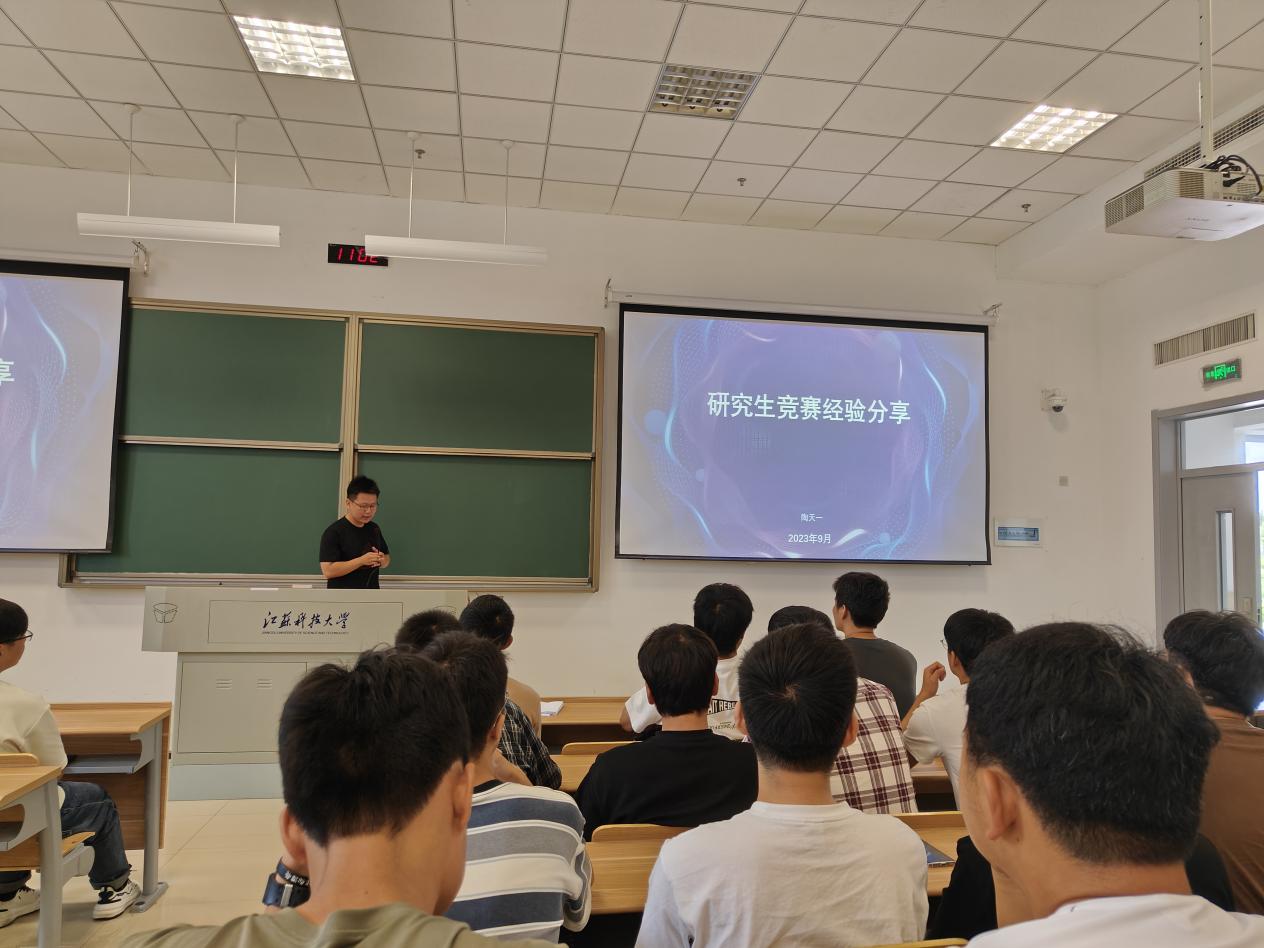 陶天一學長結合自己的科研和競賽經歷,向研一新生普及了研究生競賽相關的知識,分享了自己參加各類競賽的心得和收獲,通過參加學科競賽,不僅顯著提升了自身知識的深度和廣度,開拓了眼界,更在這個過程中體會到了科研所帶來的樂趣。行之力則知愈進,知之深則行愈達。