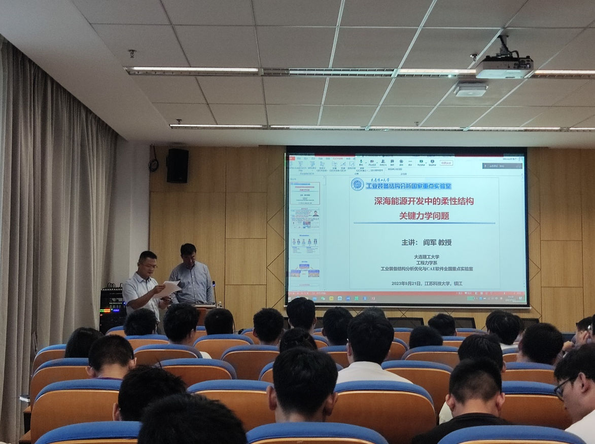 會上,閻軍教授詳細介紹了深海能源開發中的柔性結構關鍵力學問題以及最新研究進展,并對師生提出的“如何提高臍帶纜接口密封性能”等問題做出了詳細的解答,獲得了師生們的陣陣掌聲。