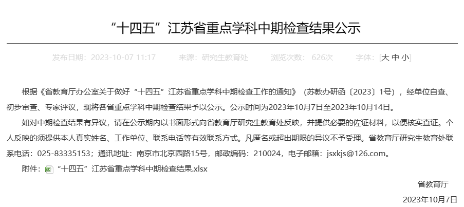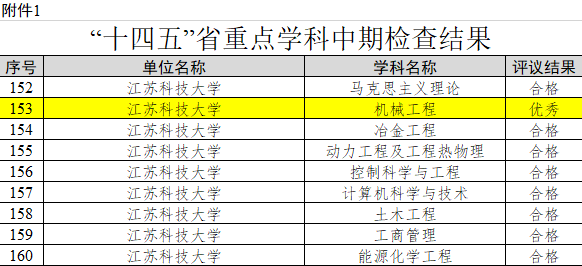 2023年10月7日,根據《省教育廳辦公室關于做好“十四五”江蘇省重點學科中期檢查工作的通知》(蘇教辦研函〔2023〕1號),經單位自查、初步審查、專家評議認定,機械工程學院機械工程學科獲評“優秀”等級。