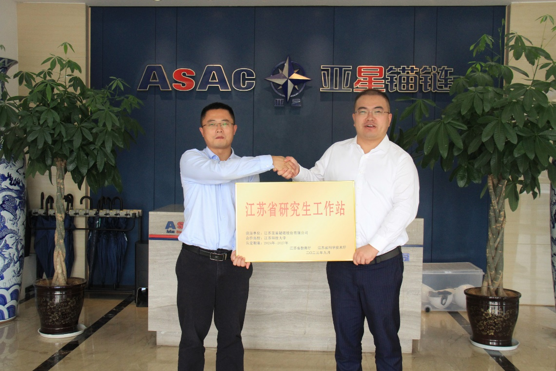 為發揮科技優勢,強化人才培養,服務產業發展,2023年月10月9日上午,江蘇科技大學機械工程學院副院長(主持工作)張建帶隊赴江蘇亞星錨鏈股份有限公司調研,并與公司董事長陶興共同為“江蘇省研究生工作站”揭牌。