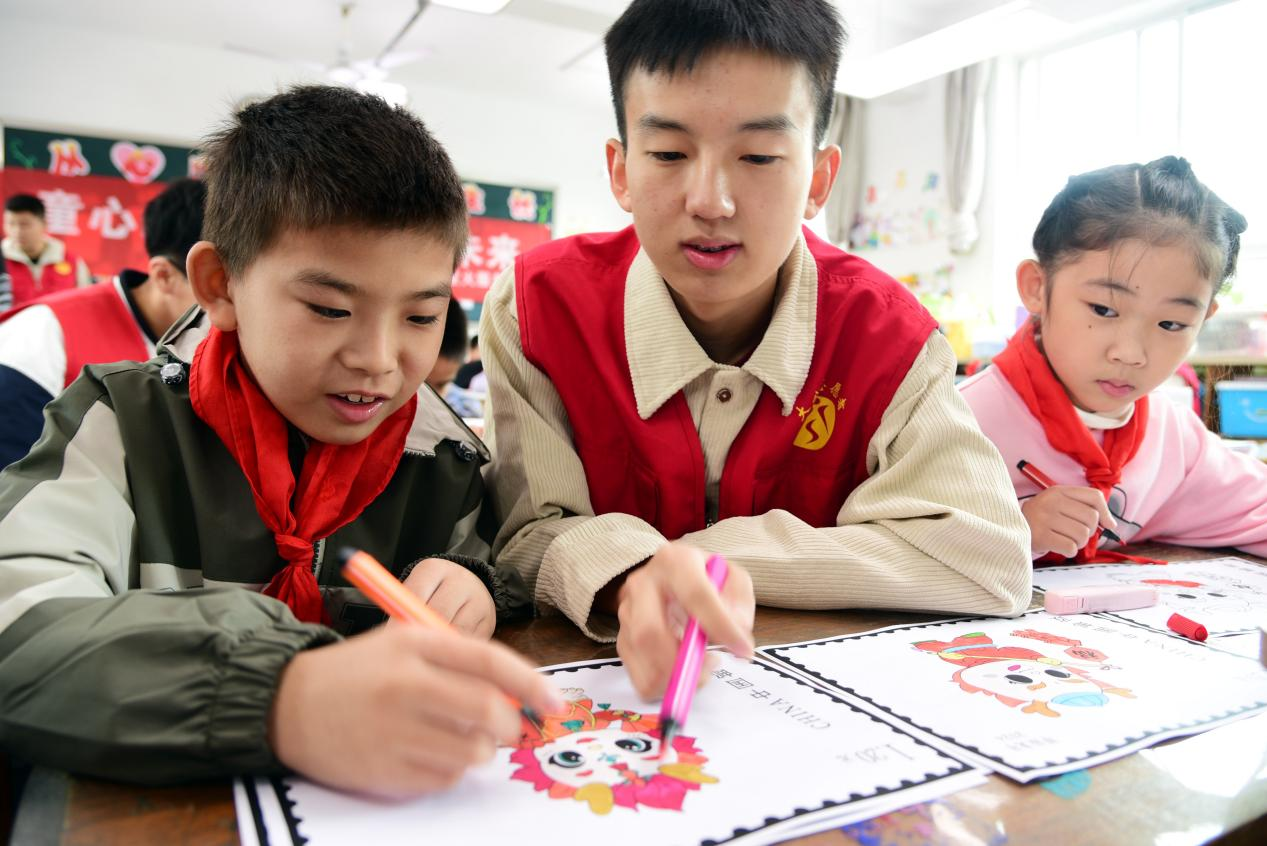 圖為志愿者與小朋友一起繪制郵票 石玉成 攝
