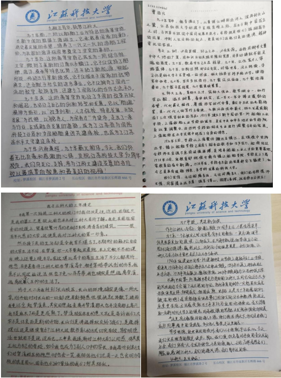 “重溫校史,征文活動”參加學生通過手寫最美情話用以祝福母校。書寫是最質樸的熱愛方式,用筆記錄難忘之事,更加深了同學們活動體驗感,展現了江科大學子朝氣蓬勃,揚帆致遠的精神。