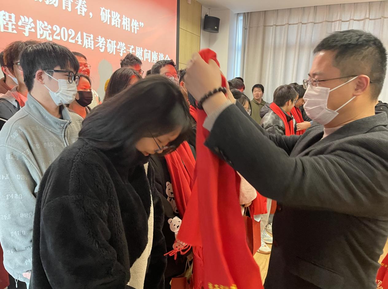 會后,各位領導為考研學子佩戴紅圍巾,寓意鴻運當頭,并合影留念。本次考研慰問活動體現了學院對考研工作的重視。希望考研學子能夠不負理想,一戰成“碩”!