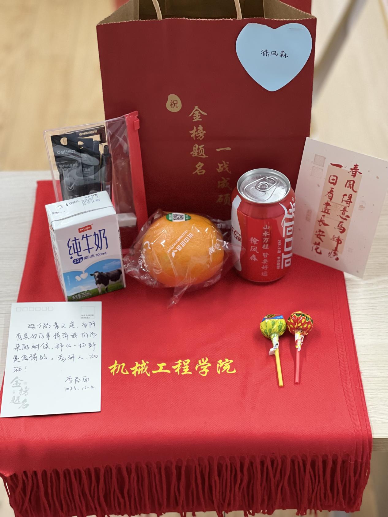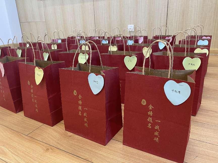 學院為考研的同學們精心準備了考研加油禮包。包括考試文具、考研署名款可樂,還有“橙”功上岸、“牛”氣沖天、“棒”上有名、師生祝福賀卡等。