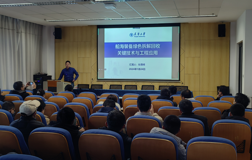 2024年1月24日,天津大學杜尊峰副教授應邀以“船海裝備綠色拆解回收關鍵技術與工程應用”為主題做了精彩的講座。機械工程學院院長張建主持本次講座,機械工程學院部分青年教師、研究生在學院426學術報告廳或在線參加了講座。