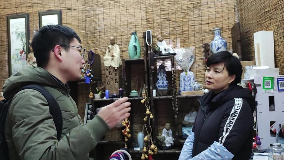 劉士鑫同學(左一)采訪店鋪老板 拍攝:鮑國強