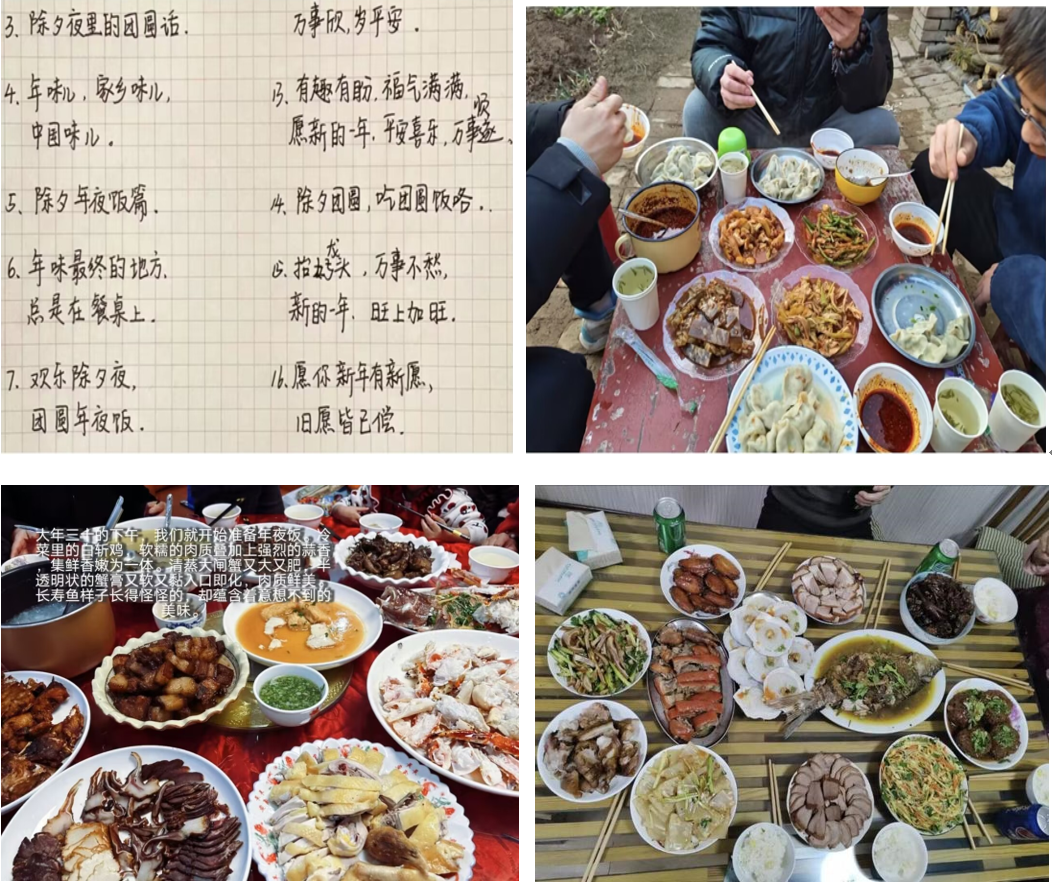 爆竹聲中一歲除,春風送暖入屠蘇。千門萬戶曈曈日,總把新桃換舊符。本次活動分為兩種參與形式,第一種為上傳年夜飯的照片或者視頻,并且附有文字介紹。本項活動旨在記錄每個家庭團圓瞬間,同時讓同學們參與到團圓飯制作的契機。千家萬戶的團圓飯照片,不僅僅是一家人團圓的記錄,更是中國人民生活越來越好的真實寫照。
