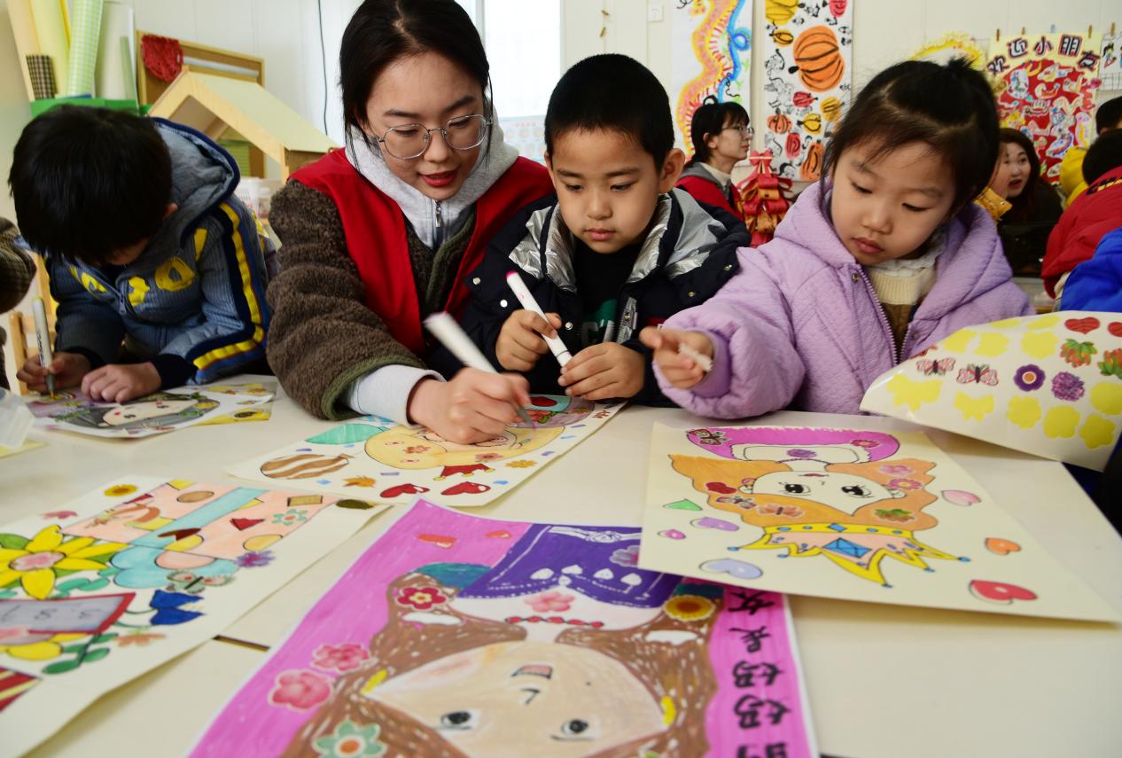 圖為志愿者和小朋友一起畫畫 謝禹紅 攝