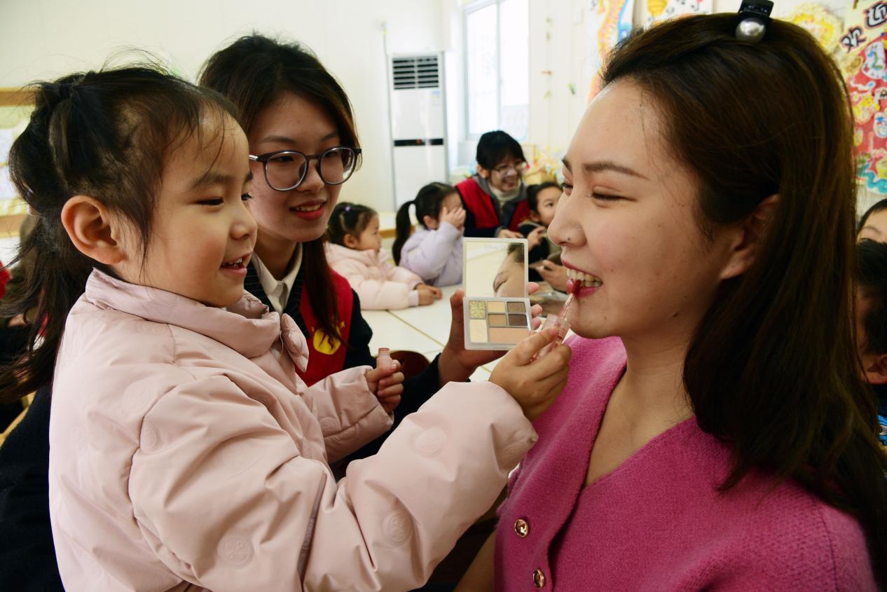 圖為志愿者幫助小朋友給媽媽化妝 謝禹紅 攝
