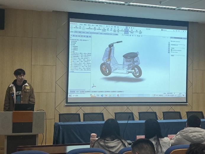 在主持人宣讀規則后,比賽正式開始,來自不同年級、不同專業的選手代表依次上臺答辯。答辯時各隊依次結合PPT輔助解說,整個現場組織有序。各組圍繞“座椅”、“龍頭”、“車身減震”等多個角度對雅迪電動車提出了自己的創新設計。在選手講解完后,評委對選手進行針對性點評,更細節性地提出建議,幫助選手進一步提升思維和創新能力,針對方案的可行性、使用場景的多變性都給出了寶貴的建議。到場的同學們精神飽滿、專注認真,賽后均表示受益匪淺。參賽隊伍中更是有別具一格的創新設計以及調試后的具體模型,獲得在場各位嘉賓的認可。