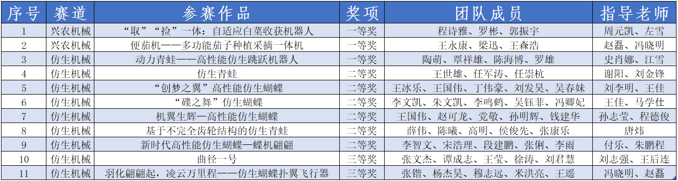 經過激烈的角逐,最終《“取”“撿”一體:自適應白菜收獲機器人》《便茄機——多功能茄子種植采摘一體機》《動力青蛙——高性能仿生跳躍機器人》3個項目獲一等獎;《“碟之舞”仿生蝴蝶》《“創夢之翼”高性能仿生蝴蝶》《機翼生輝—高性能仿生蝴蝶》《新時代高性能仿生蝴蝶—蝶機翩翩》《仿生青蛙》《基于不完全齒輪結構的仿生青蛙》6個項目獲二等獎,《羽化翩翩起,凌云萬里程——仿生蝴蝶撲翼飛行器》《曲徑一號》2個項目獲三等獎。