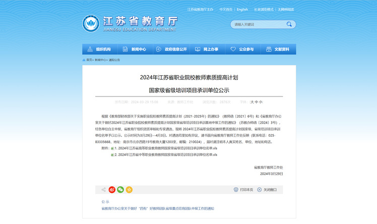 近日,江蘇省教育廳教師工作處發布了《2024年江蘇省職業院校教師素質提高計劃國家級省級培訓項目承訓單位》的公示,我院獲批承辦“青年教師教學能力提升培訓教師基本素養(理工類科研方法)”研修項目。