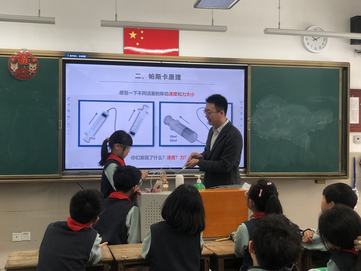 隨后,鐘教授利用注射器模仿液壓千斤頂的工作原理進行對比試驗,使學生們更加直觀地感受了液壓“省力杠桿”的效果,活動現場氣氛熱烈,學生們踴躍參與實驗操作,深刻體驗了液壓輸出力對于不同活塞面積的變化,學生們在輕松愉快的氛圍中收獲了知識,感受到了科學的魅力。