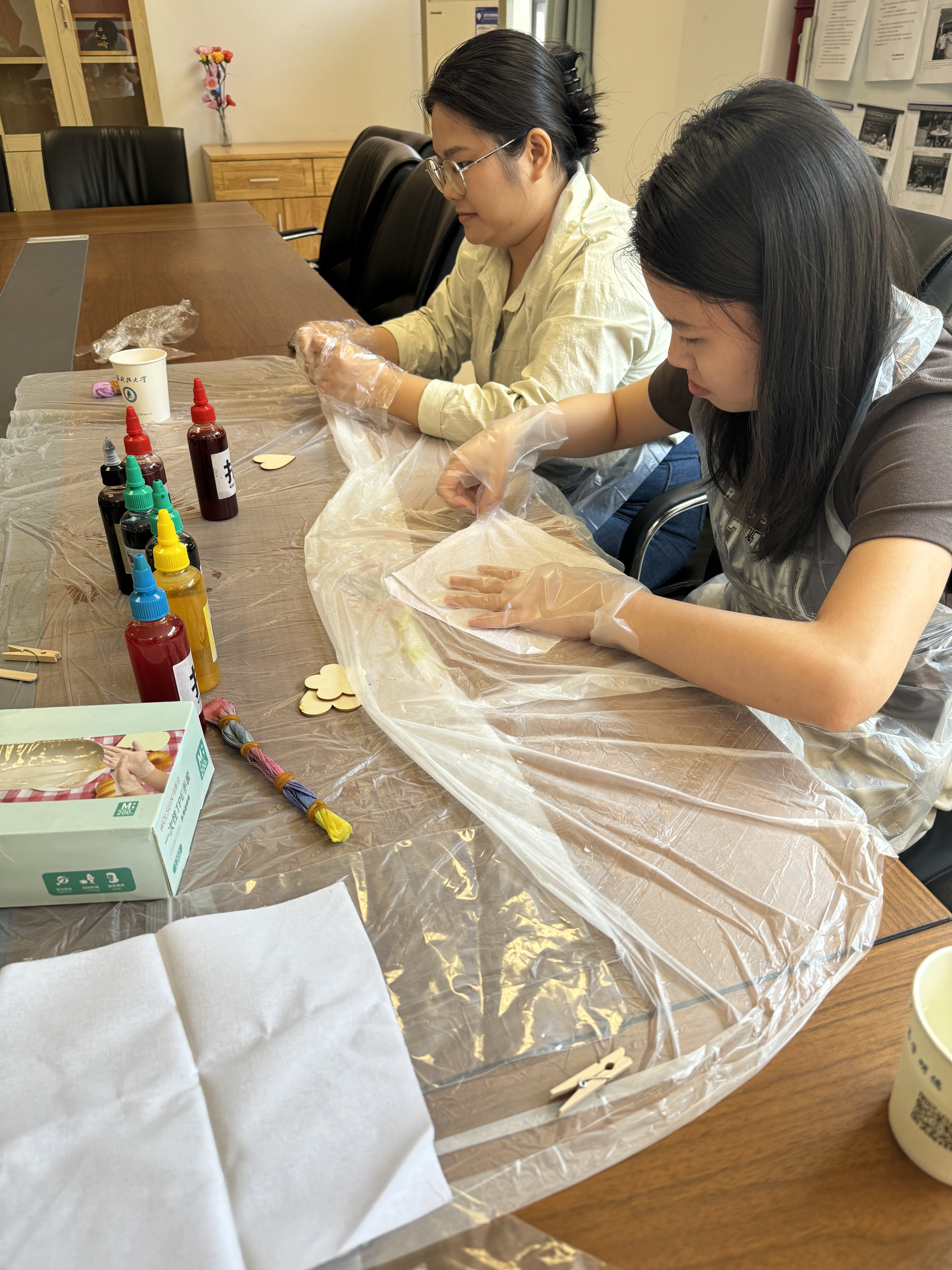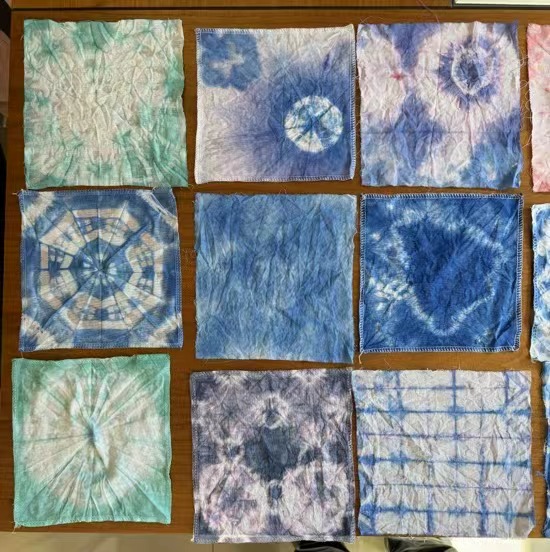 活動開始,同學們在“扎染創作”環節中,用簡單的布料和豐富的染料,將自己的創意和情感融入扎染工藝中。他們親手制作獨一無二的扎染作品,通過色彩的碰撞與融合,表達內心的情感。李老師引導大家分享創作背后的故事,幫助同學們在藝術創作中釋放壓力,增強自我認知。在“非遺文化分享”環節,同學們展示了以扎染為主題的產品設計,這些作品展示了他們對扎染文化的理解和創新。大家互相欣賞,交流心得,共同感受非遺文化的魅力。這些富有創意的作品,不僅展現了同學們的才華,也傳遞了對傳統文化的敬意。隨后,同學們參與了扎染知識競賽,通過搶答加深了對扎染歷史和工藝的理解。比賽過程中,大家積極參與,笑聲與知識交織,營造了輕松愉快的學習氛圍。