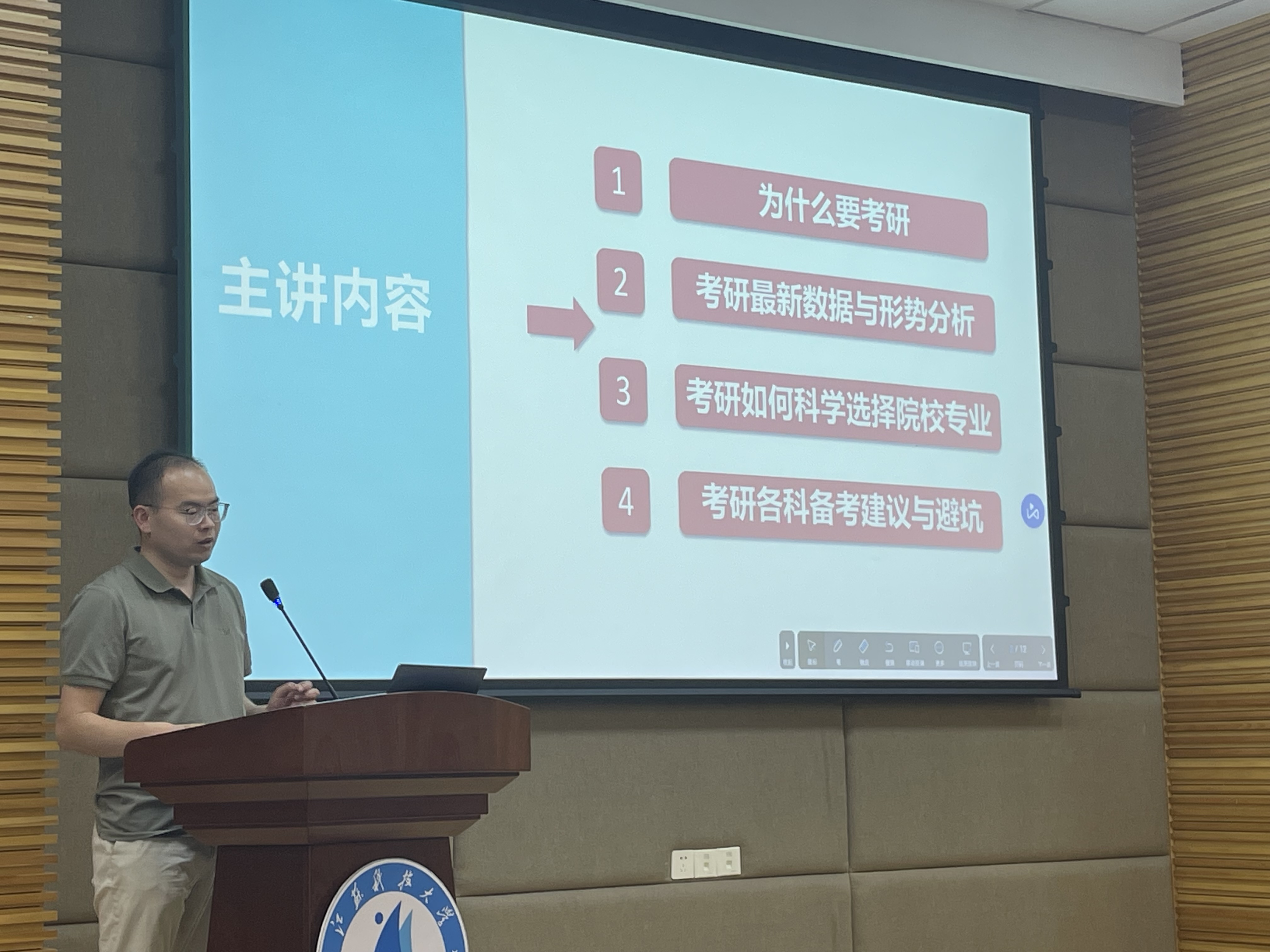 會上,李老師向學生簡要介紹當前的考研和就業形勢,以及剛剛結束的我院2024屆考研情況,概述學院前期通過調研了解到我院學子在當前備考中關心關切的問題,鼓勵大家堅定理想目標,調整好考研心態,扎實推進考研準備工作,并向大家介紹我院后續的考研輔導工作安排。隨后,潘老師用詳實的數據介紹了近年來同層次院校本專業畢業生考研的具體情況,并列舉部分案例做了詳細的分析講解。結合實際,為學生在備考計劃排期、具體科目復習等方面做了具體指導,同時提醒學生專注于當下,拒絕焦慮和無效“內卷”。