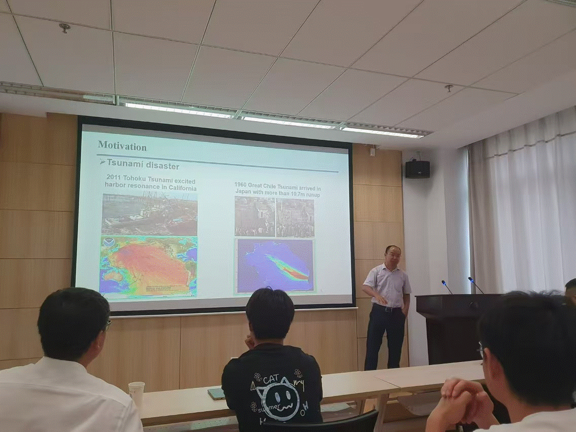 王崗教授以1960年智利大海嘯和2011年日本海嘯為例子,比較海嘯波幅圖引出海脊俘獲波現象,詳細闡述了針對該現象的解析理論推導過程,并通過數值模擬形象生動地展現了瞬態沖擊波在海脊地形上的傳播變形過程,證實了解析解的準確性。