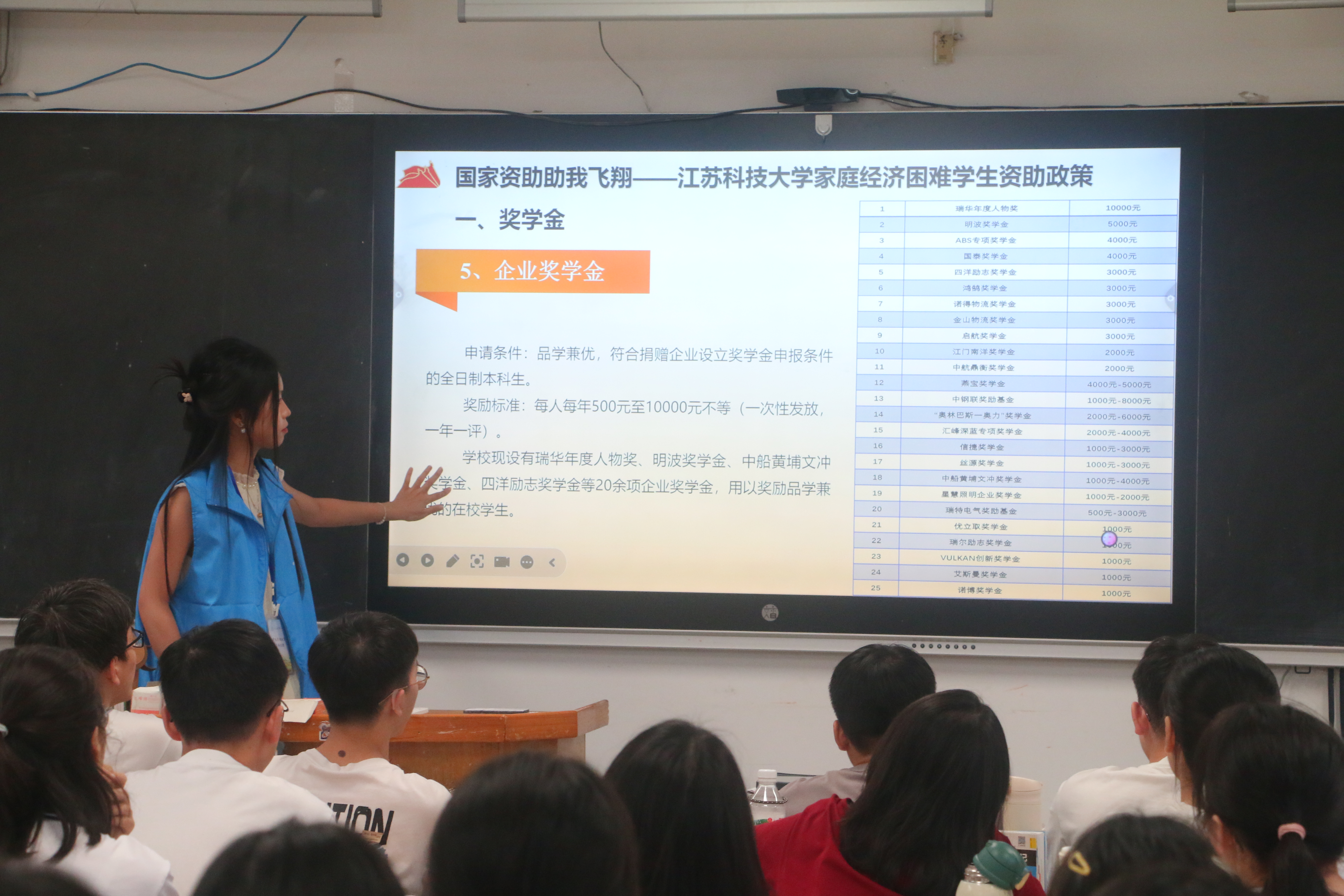 宣講中,楊小霜向高三的同學們介紹了國家資助政策,以及江蘇科技大學的“獎、助、勤、貸、減、免、補”等資助體系,申請流程、評選標準及所需材料,同時結合自己的親身經歷,與大家分享了自己如何在求學路上克服經濟困難、保持積極心態、提升自我能力的寶貴經驗,她希望通過自己的故事,讓學弟學妹們知道,無論出身如何,都不應成為追求夢想的阻礙。宣講中也有不少同學們積極提問,我也耐心解答,現場氣氛熱烈而溫馨。