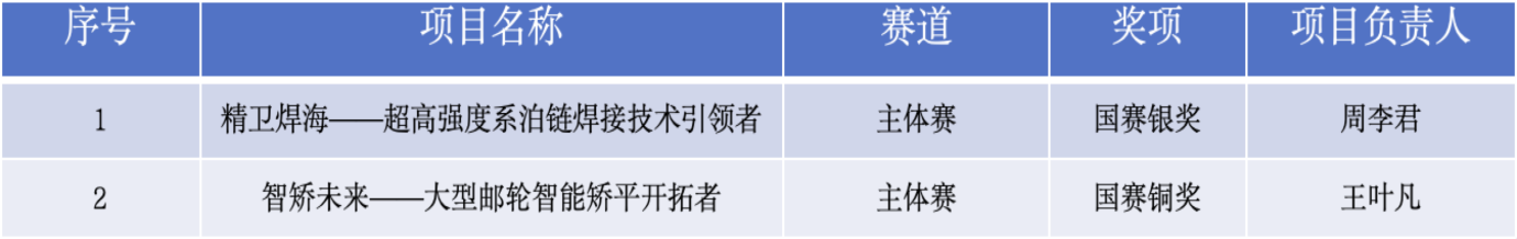 在學校黨委的領導下,機械學院黨政領導班子高度重視該項賽事,積極組織動員全院教師積極謀劃項目,從賽事伊始,圍繞項目培育提升、材料完善細化、后勤服務保障,為參賽師生提供全方位支持和指導。由機械學院蘇世杰老師指導的《精衛焊?!邚姸认挡存満附蛹夹g引領者》項目在主體賽中獲國賽銀獎;由機械學院許靜老師指導的《智矯未來——大型郵輪智能矯平開拓者》項目在主體賽中獲國賽銅獎。