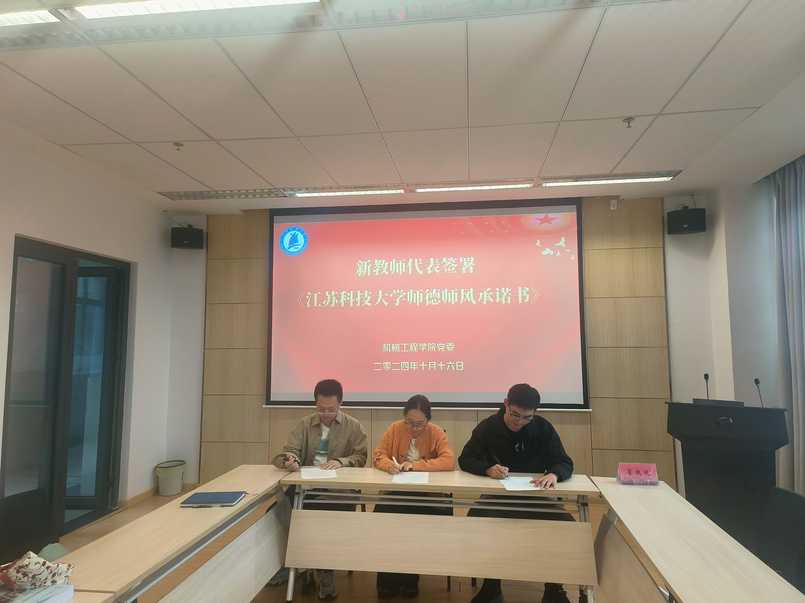 生教授從為什么要進(jìn)行師德師風(fēng)教育、師德師風(fēng)教育是什么和青年教師應(yīng)該如何做三個(gè)方面為青年教師們講述了師德師風(fēng)教育的政治性、時(shí)代性和現(xiàn)實(shí)性,教育青年教師要在練好教學(xué)基本功的基礎(chǔ)上,在為學(xué)、為事、為人方面做好學(xué)生楷模,不忘初心,積極投身教育事業(yè)。講座結(jié)束后,新進(jìn)教師簽訂了師德承諾書并莊嚴(yán)宣誓《江蘇科技大學(xué)師德公約》。