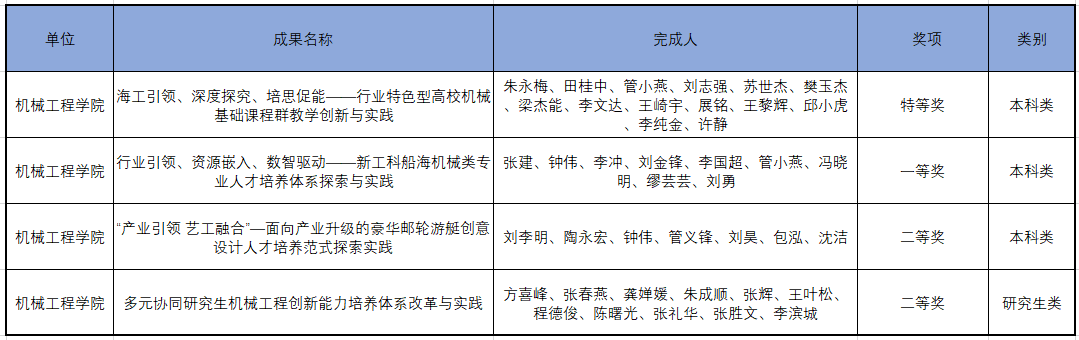 近日,2024年江蘇科技大學教學成果獎獲獎名單公布,學院4項教學成果獲獎,其中本科類特等獎1項、一等獎1項、二等獎1項,研究生類二等獎1項。本次學校教學成果獎共遴選出28項,其中特等獎3項、一等獎7項、二等獎18項,我院獲獎總數列全校第一。