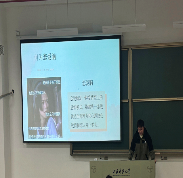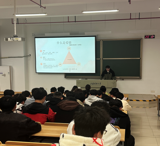 活動現場,兩個班級無人缺席,同學們的臉上洋溢著青春的氣息,眼中透露出對此次班會主題的好奇與期待。從經典文學作品中的愛情故事,到心理學家對愛情的科學分析,再到歷史人物的愛情傳奇,主講人陳安萬通過理論講解和案例分析的形式和同學們進行了積極分享。