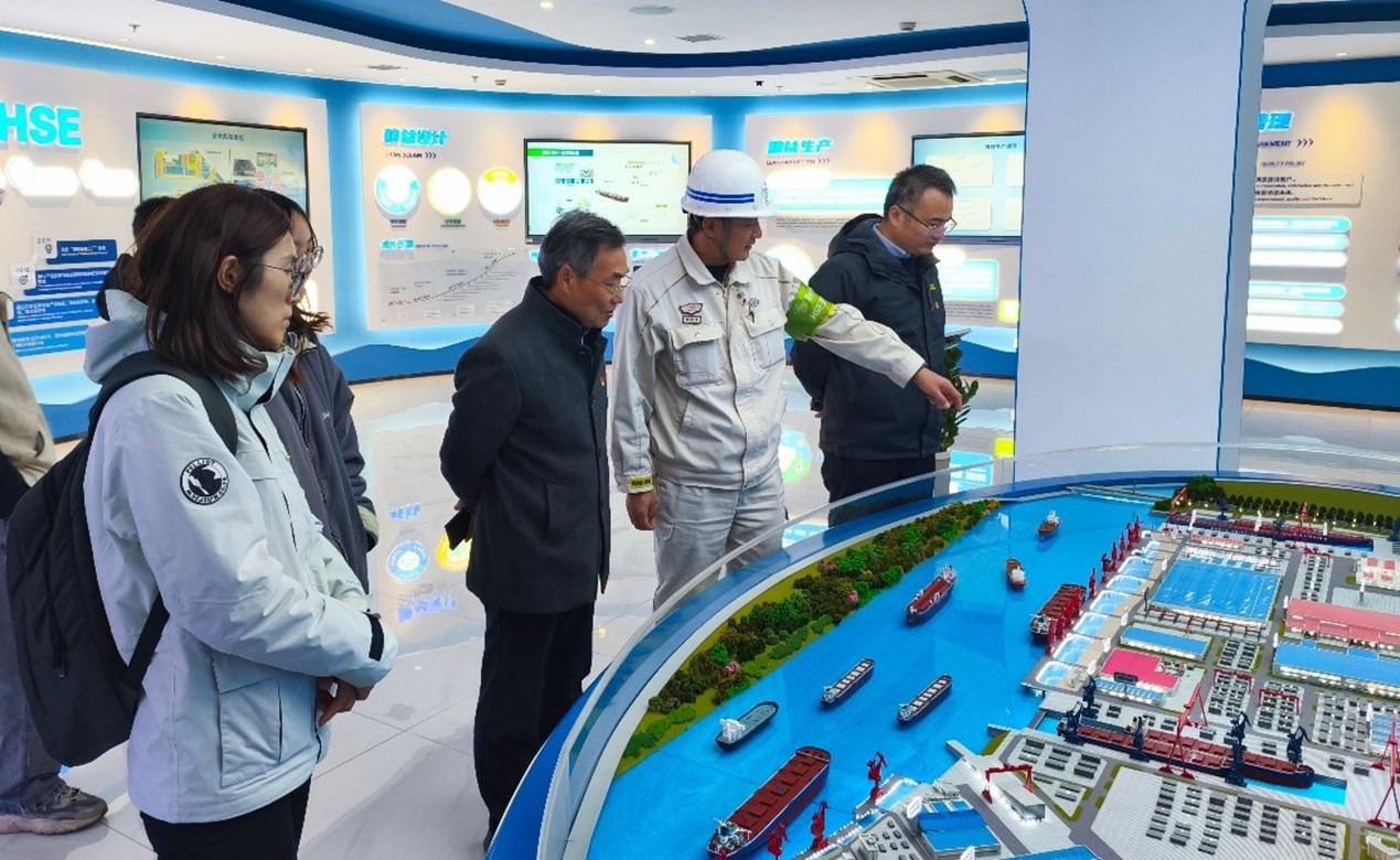 隨后,揚州中遠海運重工有限公司的工作人員帶領全體黨員參觀了企業文化館,支部成員深入了解了企業發展歷史。同時,支部師生一起參觀了正在舾裝的集裝箱船。