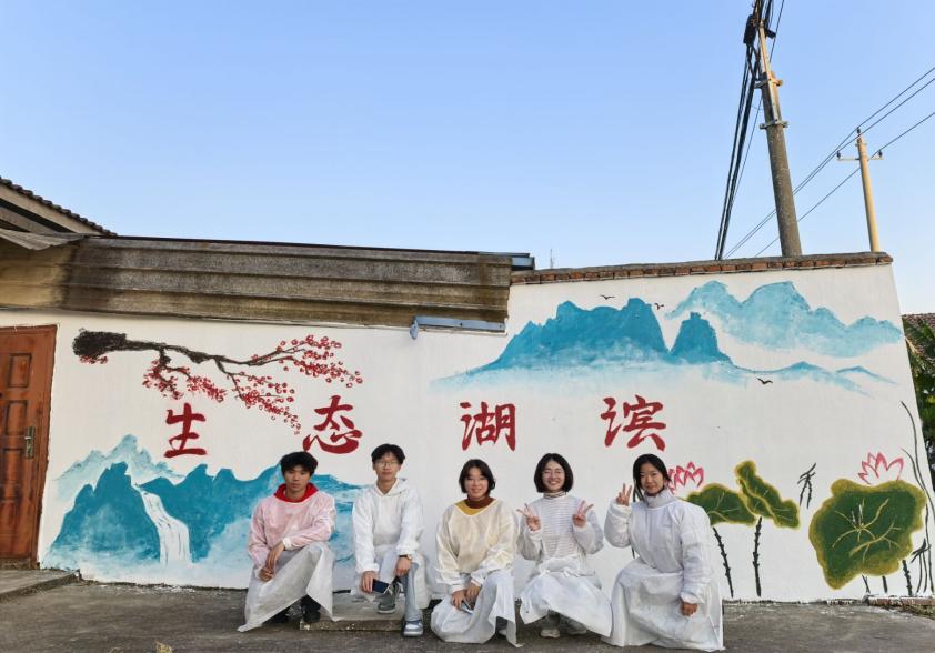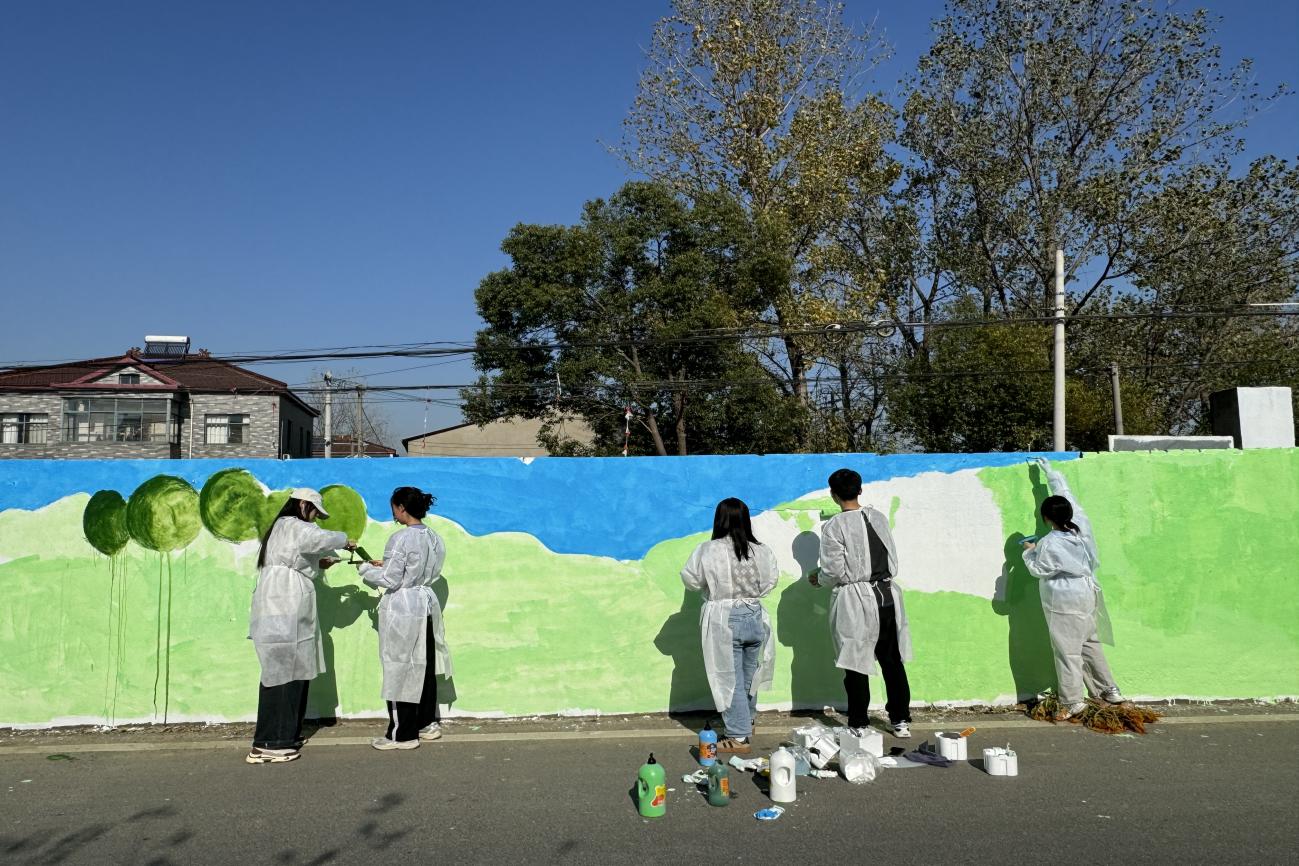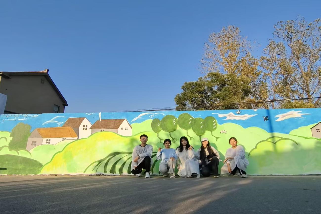 活動(dòng)伊始,志愿團(tuán)成員進(jìn)行了實(shí)地考察,并與村委會負(fù)責(zé)人溝通交流,著手準(zhǔn)備設(shè)計(jì)圖稿并敲定。緊接著,志愿團(tuán)成員在輔導(dǎo)員尹子琪的安排下分為四組,各小組志愿者們進(jìn)行了簡短的交流與分工之后,便開始了墻畫的繪制工作。志愿者們手持畫筆,大筆鋪色,小筆勾勒,一道道程序井然有序,用五彩斑斕的顏料和積極向上的創(chuàng)意,為湖濱村增添了一道亮麗的風(fēng)景線,用畫筆展現(xiàn)湖濱村最美好的一面。