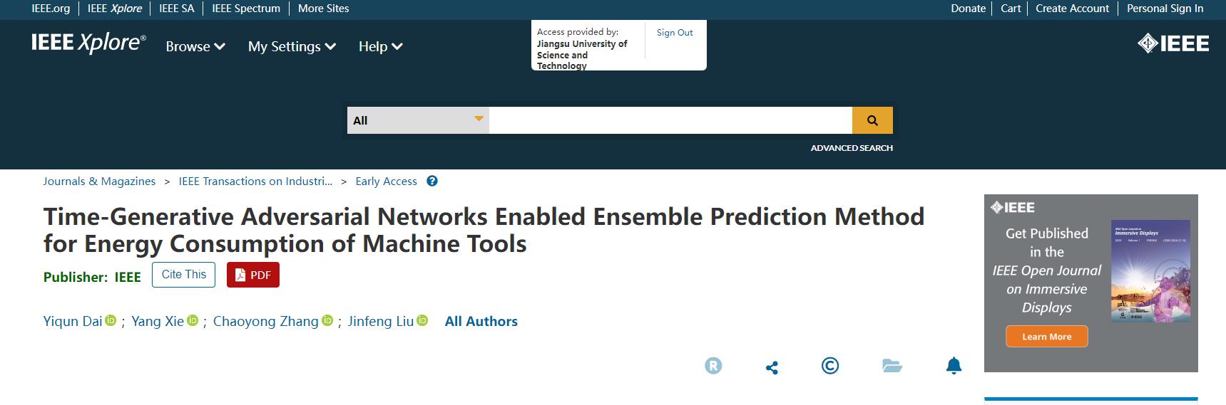 近日,機械工程學院船舶與海工裝備智能制造團隊22 級碩士研究生戴逸群在國際工業(yè)信息領(lǐng)域的頂級期刊IEEE Transactions on Industrial Informatics(影響因子11.7,中科院一區(qū)TOP)上以第一作者身份發(fā)表論文《Time-Generative Adversarial Networks Enabled Ensemble Prediction Method for Energy Consumption of Machine Tools》,機械工程學院謝陽老師為通訊作者。同時,針對數(shù)控加工能耗預測模型的對比研究,在國際環(huán)境工程頂級期刊Journal of Cleaner Production(影響因子9.8,中科院一區(qū)TOP),以謝陽老師第一,戴逸群第二作者身份發(fā)表論文《An integration model enabled deep learning for energy prediction of machine tools》。