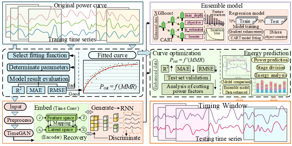 研究團隊針對工業(yè)場景中小樣本學習問題,提出了一種數(shù)據(jù)增強的機床能耗集成預測方法,并通過時間序列過程生成對抗網(wǎng)絡提取加工全過程特征,利用增強樣本訓練集成模型并對機床加工全過程做回歸預測,進一步形成一種基于集成模型和長短期記憶神經(jīng)網(wǎng)絡的機床能量預測模型,解決了數(shù)控機床能耗動態(tài)特性表征不明確的問題。并以數(shù)控銑削過程為例,證明了所提出模型對機床運行狀態(tài)識別的準確率可以提高到96.8%,從而在未來能夠為制造企業(yè)建立精準的能耗預測系統(tǒng),助力“雙碳”目標達成。
