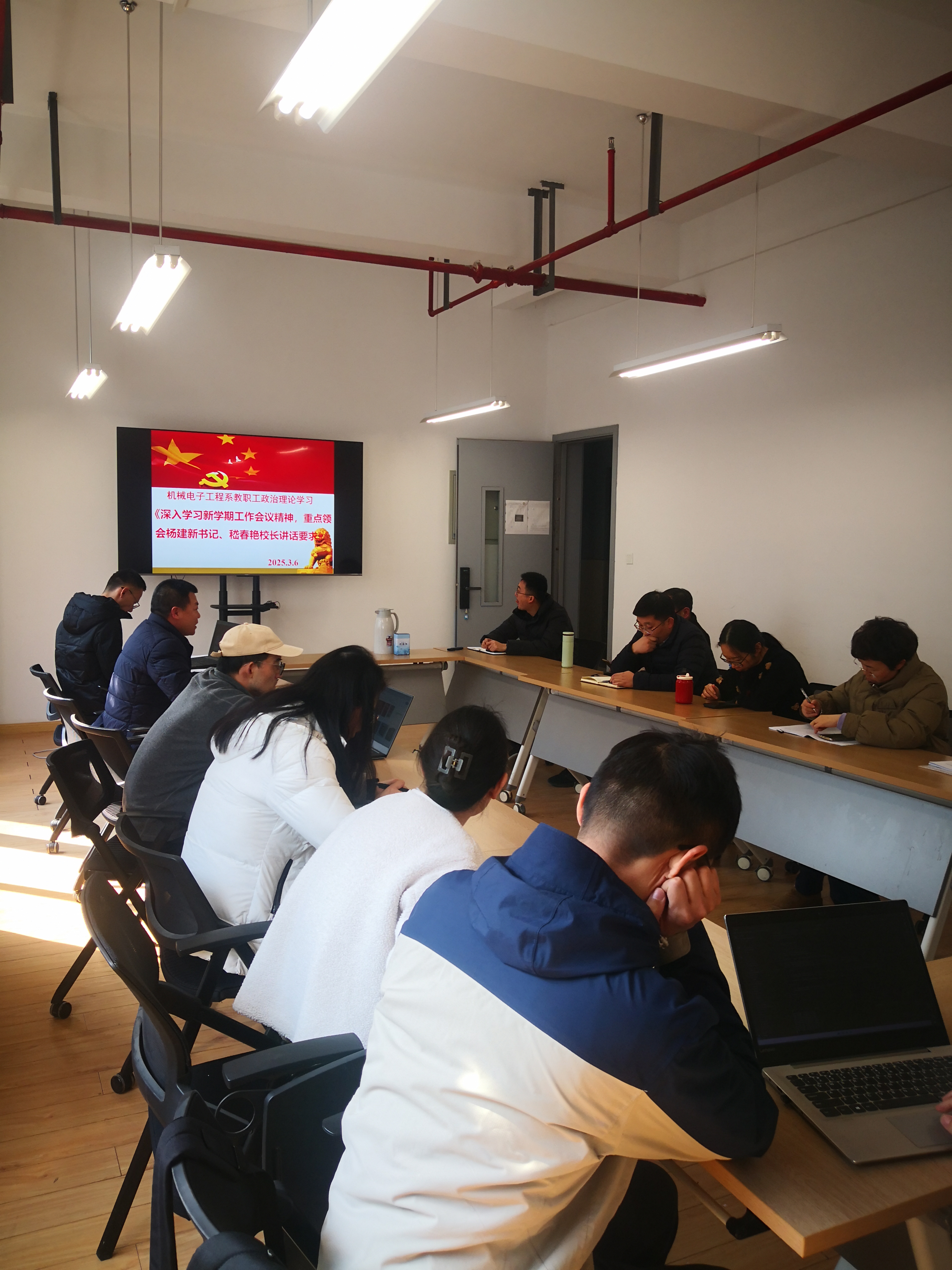 各系部教職工深入學習2025年全國教育工作會議精神、《教育強國建設規劃綱要(2024-2035年)》和新學期工作會議精神,緊密結合崗位職責和學校發展實際,思考如何圍繞立德樹人根本任務,切實增強學生自主能力培養,建設素質精良的教師隊伍,推動優勢學科與重點行業和頭部企業強強聯合等相關問題;結合學校發展態勢,立足實際,思考如何把握歷史機遇,凸顯辦學特色,提升學科建設、人才培養、科技創新水平,推進學校高水平大學建設,在新征程上開創學校高質量發展新局面。