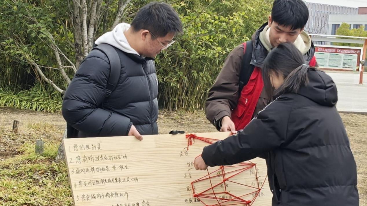 活動啟動前,星火服務社成員提前來到活動現場精心布置了雙層互動區:左側立體板貼滿古今束縛女性的刻板標簽,右側紅繩繞釘問答板充滿趣味。活動伊始,路過的同學們紛紛被精美溫馨的活動現場吸引而來。志愿者們引導參與者了解規則后,人流自然分向兩個體驗區。撕標簽互動區成為全場焦點。掛有"女性就該早早結婚生子"等刻板印象的立體板前,一位短發女生突然駐足。她目光灼灼鎖定某張標簽,利落撕下的瞬間,背面"人生節奏由你定義"的金句躍入眼簾。女生攥著紙片怔住,從慍怒到釋然的情緒流轉間,仿佛完成了對刻板印象的無聲解構。隨著被撕下的標簽越來越多,展板逐漸顯露出底色上"打破定義""生而自由"等燙金宣言,如同揭去蒙在社會認知上的陳舊濾鏡。活動尾聲,志愿者們為每位參與者送上鮮花。嬌嫩花瓣映著年輕面龐,宛如無數個正在破繭的新生夢想。