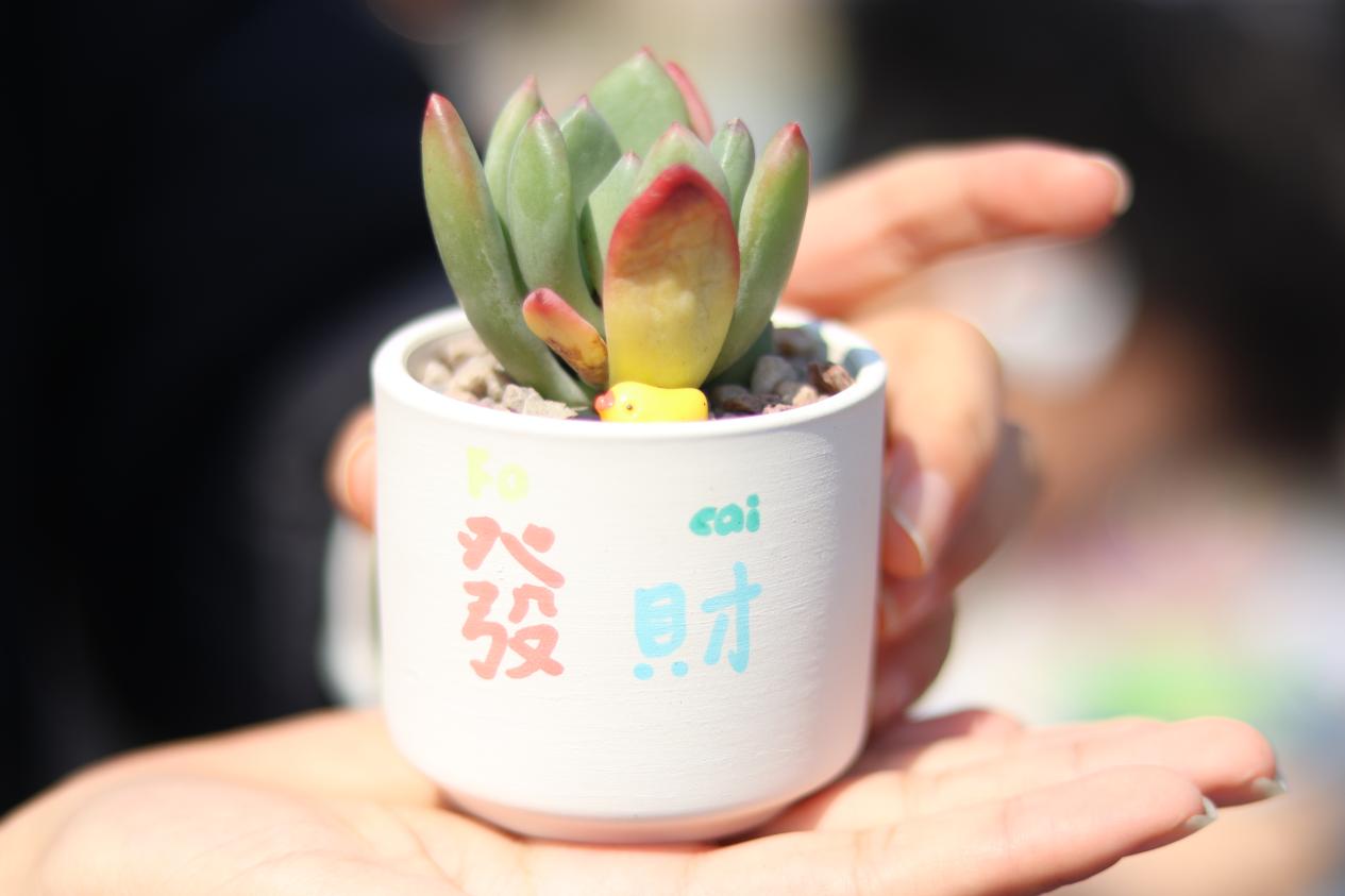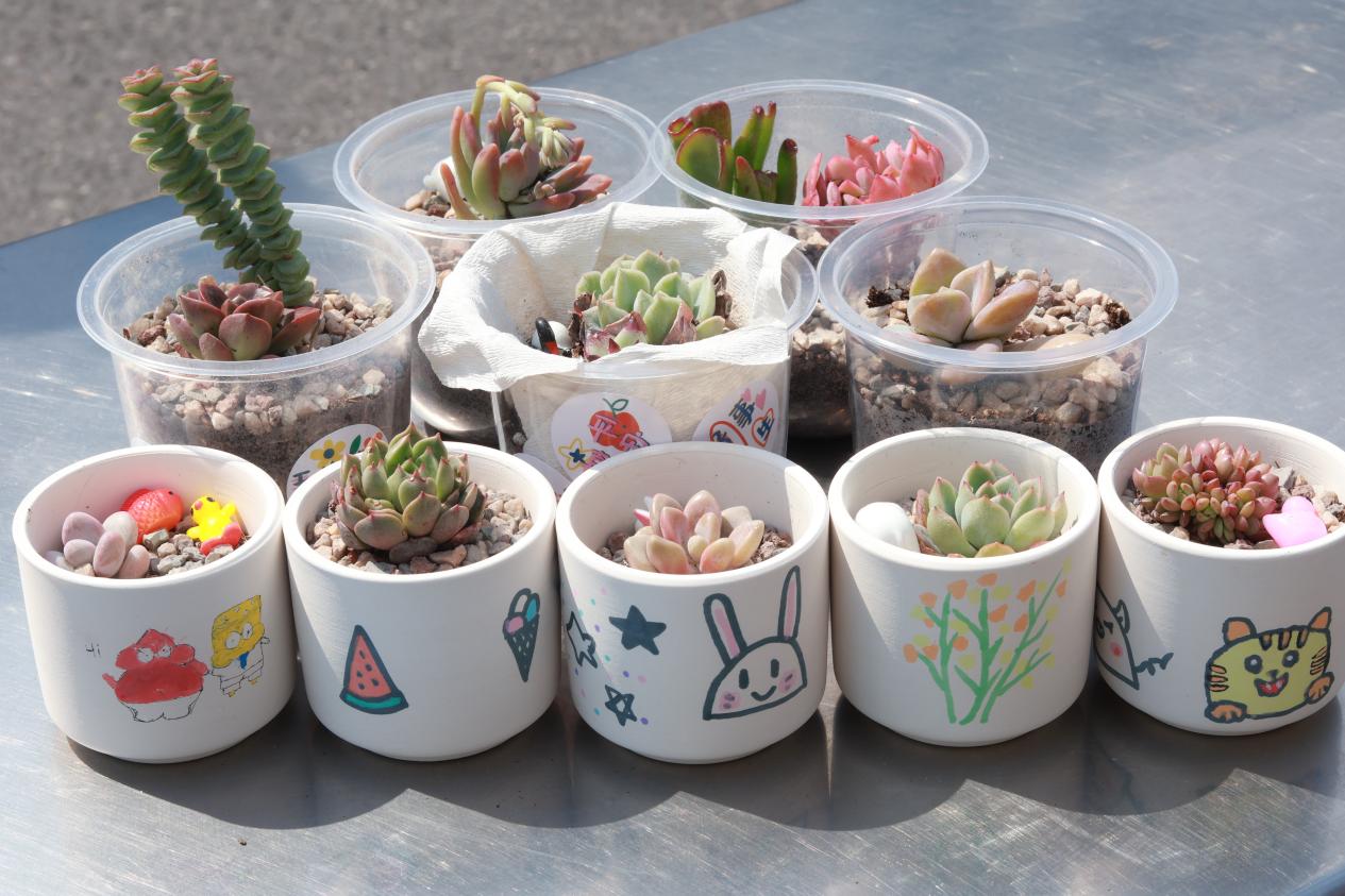 活動(dòng)現(xiàn)場,擺放著各式各樣憨態(tài)可掬的多肉植物,肥厚的葉片飽滿多汁,仿佛藏著整個(gè)春天的生機(jī)。旁邊整齊排列的素色花盆,以及琳瑯滿目的DIY材料,如顏料、畫筆、彩色貼紙、小裝飾等,瞬間點(diǎn)燃了同學(xué)們的創(chuàng)作熱情。
