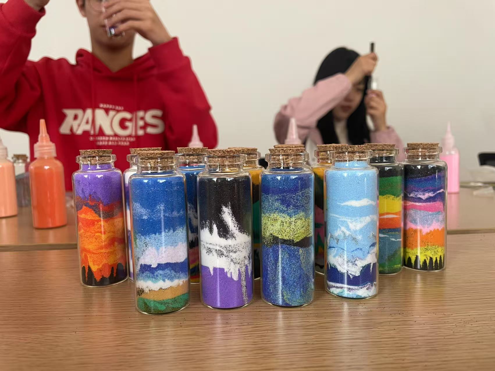 活動現場,同學們通過"選色-構思-繪制"將五彩細砂分層注入透明玻璃瓶內。以沉浸式創作的方式將近期的學習壓力、情感困惑轉化為具象化的藝術表達。機制專業的王同學分享創作感悟:"當指尖流動的彩砂在瓶中定格成情緒畫卷時,那些困擾我的焦慮突然變得具象可感,完成作品后心情豁然開朗,仿佛完成了一次心靈SPA"