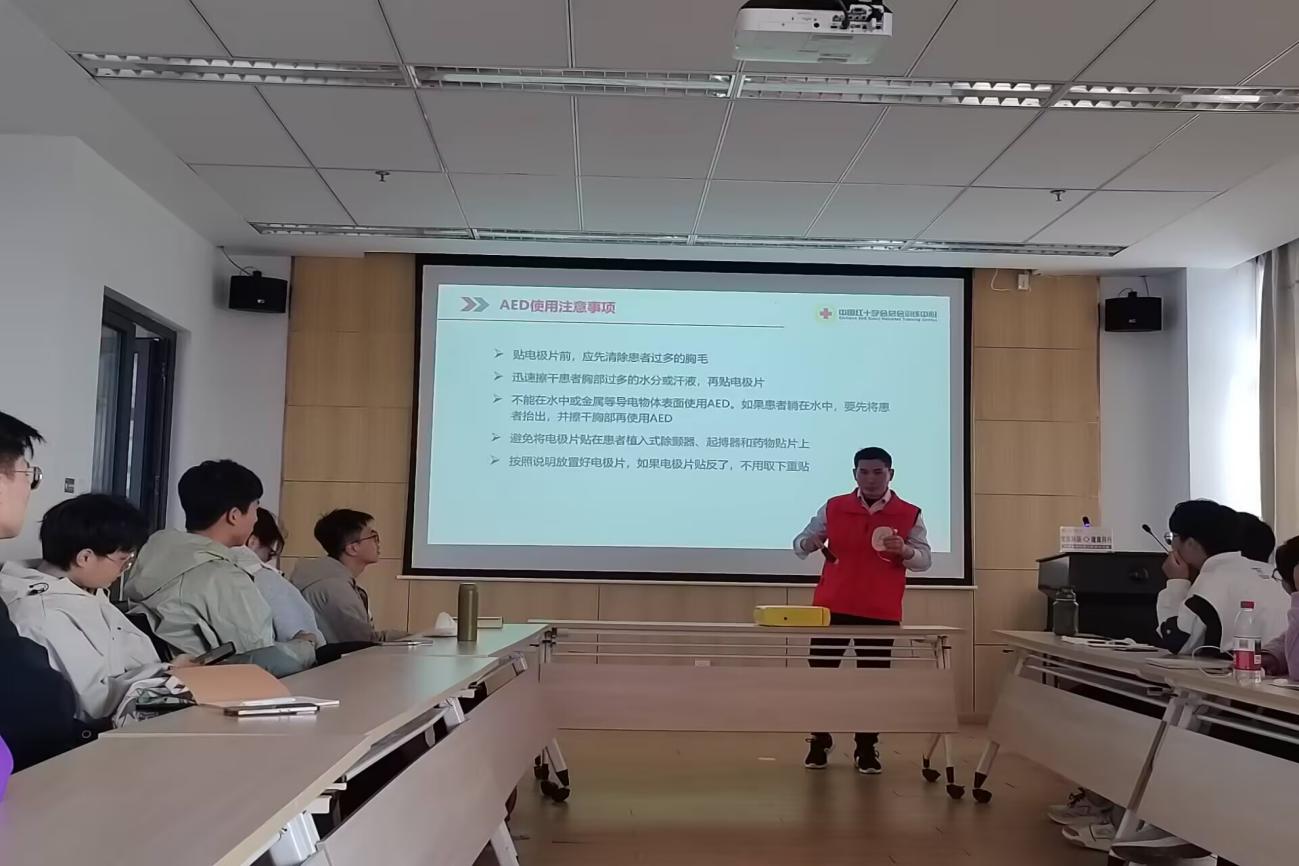 培訓課程涵蓋理論講解與實操演練兩大模塊。理論課程由鎮江市紅十字會應急救護師資、江蘇科技大學校醫院副院長徐勛淦主講,重點介紹了常見急救方法和創傷救護理論。為更好開展實操訓練,參訓學生分設3個小組同步開展心肺復蘇操作練習、AED機及使用方法練習和基礎創傷救護操作練習。同學們熱情高漲,每位學員均通過模擬操作考核,確保技能掌握達標。