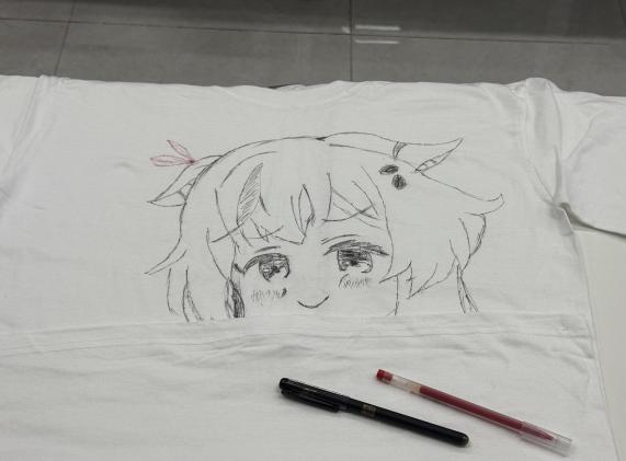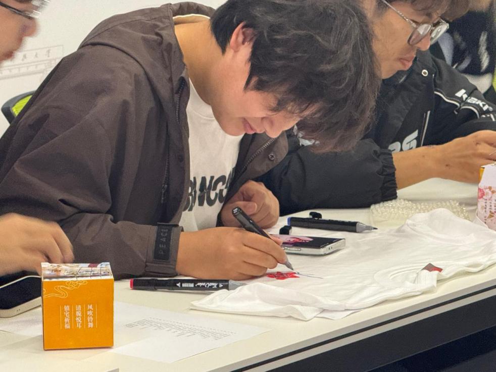 活動現(xiàn)場洋溢著青春躍動的氣息,設(shè)計同學進行頭腦風暴、物料同學甄選顏料畫筆、繪制同學屏息凝神地在白布上勾勒靈動的輪廓。片刻后,一件件獨具匠心的白色T恤衫誕生了,從充滿夢幻色彩的星空圖案,到極具藝術(shù)感的抽象線條,再到承載美好祝愿的文案,每一件白色T恤衫都珍藏著屬于這個春日的獨家記憶。