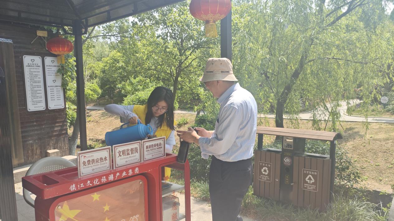 圖為志愿者為游客倒熱水 高佳慧 攝