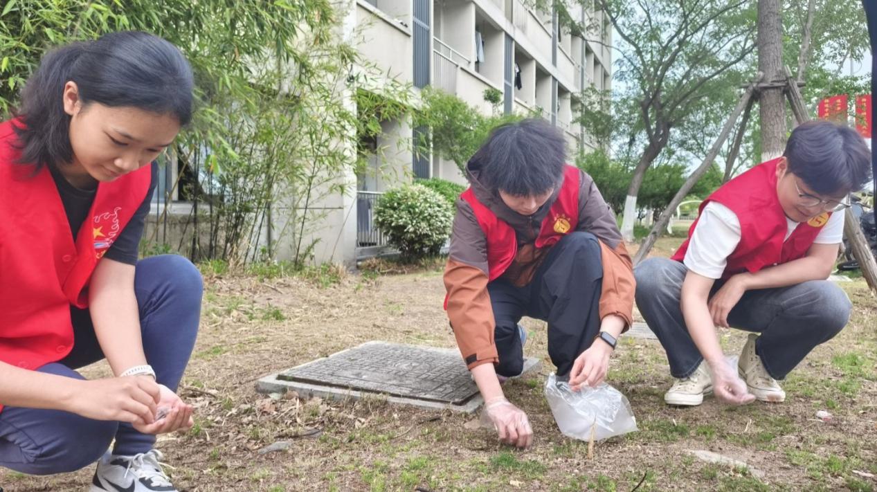 圖為志愿者撿拾宿舍樓下的煙頭 周航宇 攝