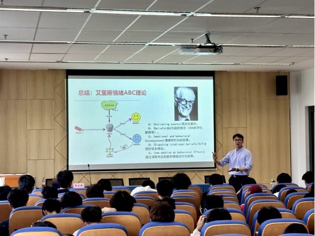 為幫助學(xué)生掌握應(yīng)對(duì)方法,王老師引入艾里斯情緒ABC理論,詳細(xì)闡釋A(誘發(fā)性事件)、B(信念)、C(情緒和行為后果)、D(不合理信念辯論)、E(新的情緒及行為效果)之間的關(guān)系,指導(dǎo)學(xué)生通過調(diào)整認(rèn)知來應(yīng)對(duì)負(fù)面情緒。講座最后,王老師寄語學(xué)生“打破‘焦慮’的是行動(dòng),沖破‘迷茫’的是規(guī)劃” ,鼓勵(lì)大家積極面對(duì)大學(xué)生活。