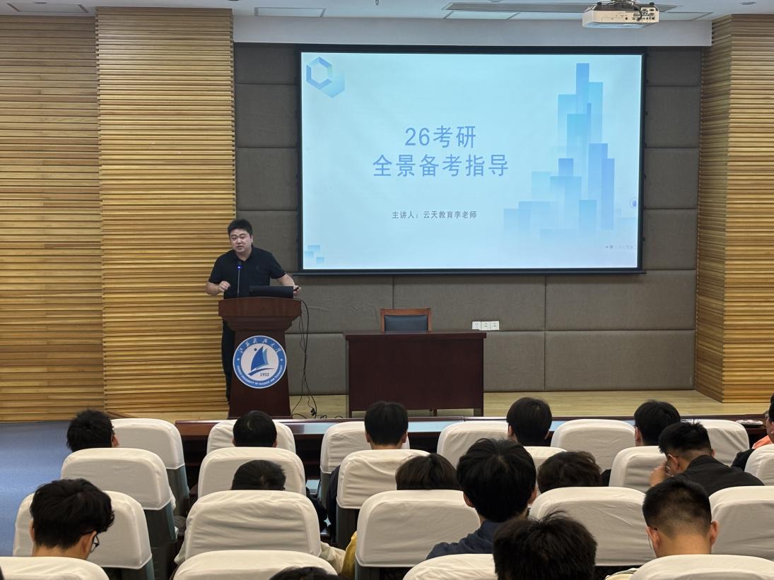 分享環(huán)節(jié)結(jié)束后,云天教育李老師以“26屆考研全景備考指導(dǎo)”為題帶來精彩講解。他結(jié)合就業(yè)形勢闡述考研必要性,剖析擇校要素,解讀25屆考研新趨勢與往屆學(xué)院考研數(shù)據(jù),還針對各科目細(xì)化復(fù)習(xí)規(guī)劃、推薦適配資料。其講解邏輯清晰、干貨滿滿,為同學(xué)們梳理出系統(tǒng)的備考思路,帶來全新啟發(fā)。