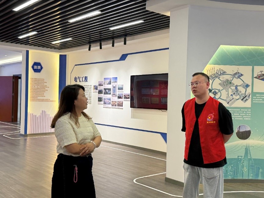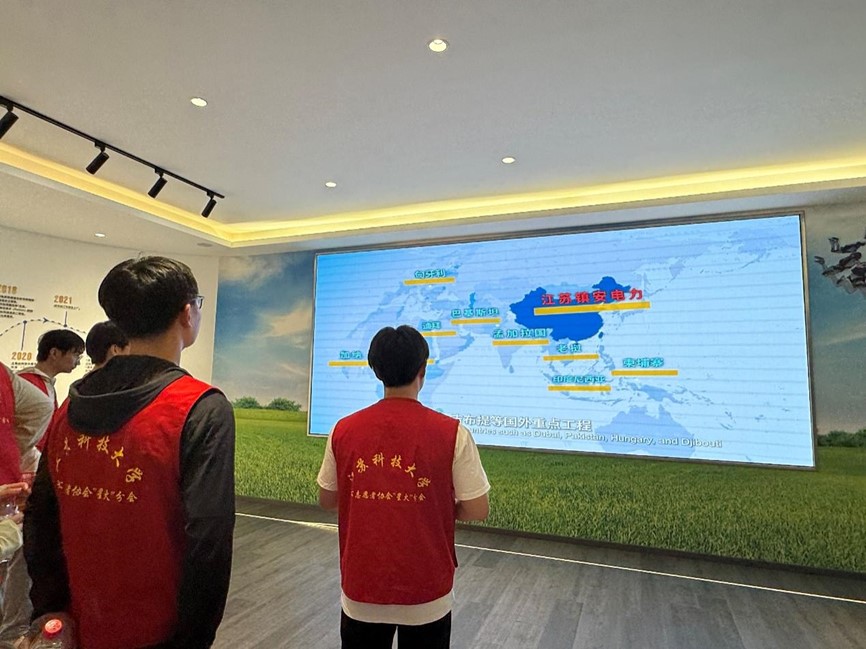 江蘇鎮安電力有限公司人事部朱主任向實踐團隊介紹了公司近年來在“走出去”戰略中的典型案例,詳細展示了鎮安電力在“一帶一路”沿線國家的重要項目布局。隨后,成員們來到“市場開拓”展區,圍繞國際合作與市場發展這一板塊進行深入參觀。實踐團成員在現場認真記錄市場圖譜與合作案例,并圍繞企業出口產品類型、海外工程配套能力等方面提出了具有專業性的提問。