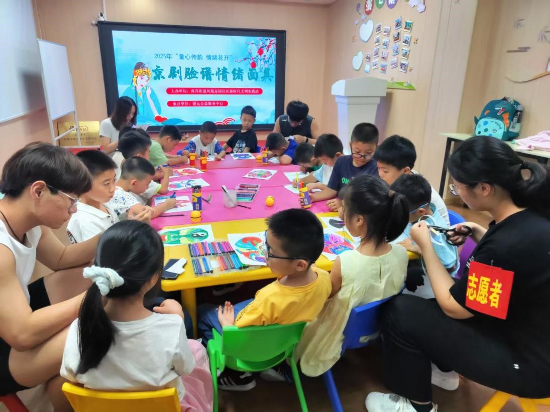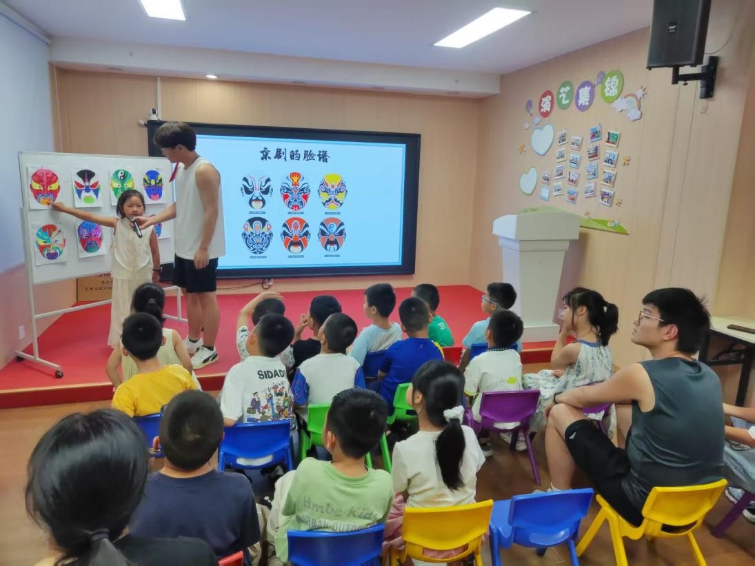 7月8日,成員們陪小朋友進行臉譜繪制活動。成員們為孩子們介紹了臉譜的相關知識,講解了不同顏色在臉譜中代表的情緒和性格。繪畫過程中,孩子們興奮地模仿著臉譜所代表的人物神態,教室里充滿了歡聲笑語。