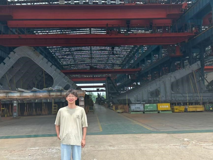 實(shí)踐團(tuán)成員王其杰來(lái)到中遠(yuǎn)海運(yùn)重工有限公司進(jìn)行實(shí)踐。他參觀了船舶分段建造的整個(gè)過程,并且看到技術(shù)人員在為了船舶建造智能化轉(zhuǎn)型而作出努力,看到一線工人在炎熱的廠房里進(jìn)行船體的焊接、噴繪與組裝,讓他深深感受到了精益求精、追求卓越的精神。也讓他明白在船舶建造中,要以時(shí)間沉淀品質(zhì),堅(jiān)守專業(yè)操守,同時(shí)勇于突破,賦予船舶靈魂,為中國(guó)船舶事業(yè)不斷奮斗。