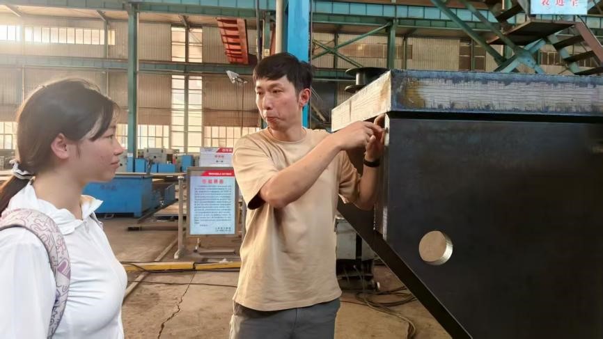 實(shí)踐團(tuán)成員路珊珊、蘇晶瑩前往揚(yáng)州市揚(yáng)力液壓設(shè)備有限公司進(jìn)行調(diào)研,探尋“工匠精神”的光芒。她們參觀了焊接、裝配等車間,了解了液壓機(jī)制造的整個(gè)流程,并且注意到由于客戶的個(gè)性化需求,很多零件都是人工焊接的,這讓她們感受到這種需要吃得下苦的工匠精神是每個(gè)人共同努力匯聚而成的理想信念。最后,車間主任告訴她們,一門工藝的延續(xù)不僅是舊人帶新人,更是幾代人對(duì)一項(xiàng)工藝的苦心鉆研。這種寶貴的“傳承”是工匠精神最動(dòng)人的一面。