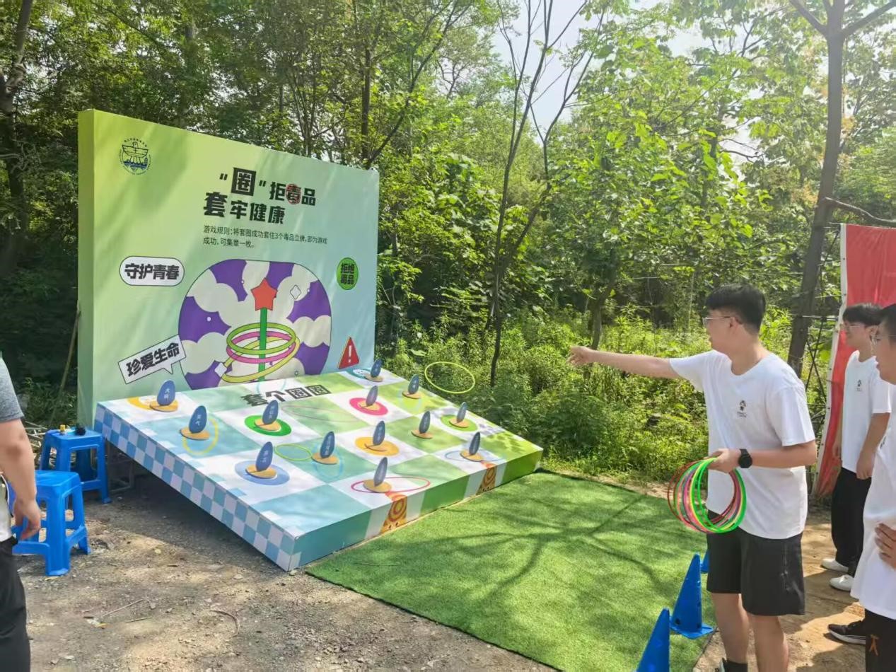 禁毒套圈區域擺放新型毒品的仿真模型,以及寫著禁毒標語的展板。參與者需投擲套圈,套中目標獲得對應的禁毒知識卡片。例如,套中“奶茶粉偽裝毒品”模型,可通過卡片了解新型毒品的常見偽裝形式。志愿者在旁同步講解,讓警惕毒品的意識深植人心。